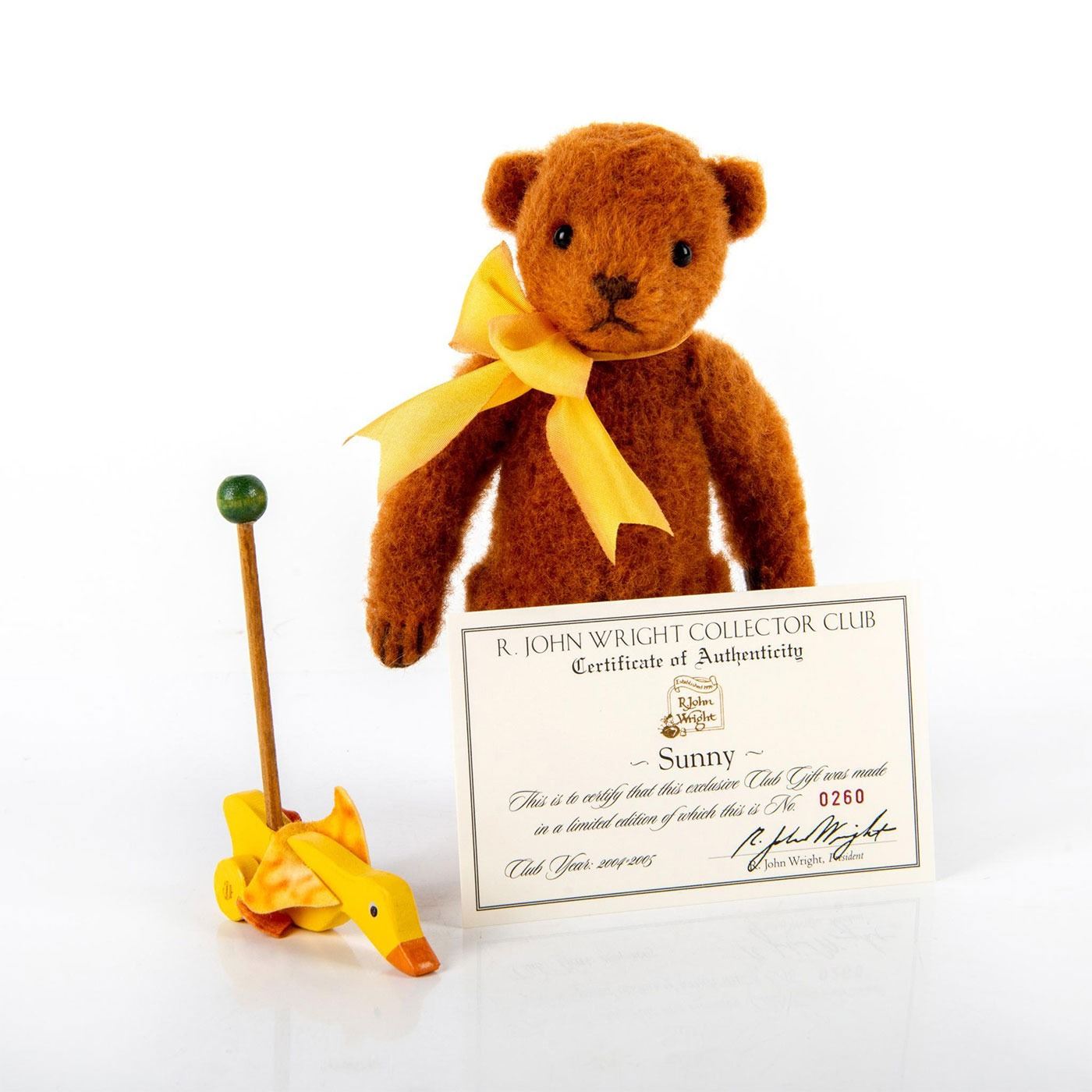 Made exclusively in 2004 for the R. John Wright Collector Club in a limited edition of 445. Modeled as a brown teddy bear with a wooden duck toy. Yellow ribbon tied around his neck. Made of Mohair plush with embroidered features and glass eyes. RJW brass button to backside. Includes original box and Certificate of Authenticity.