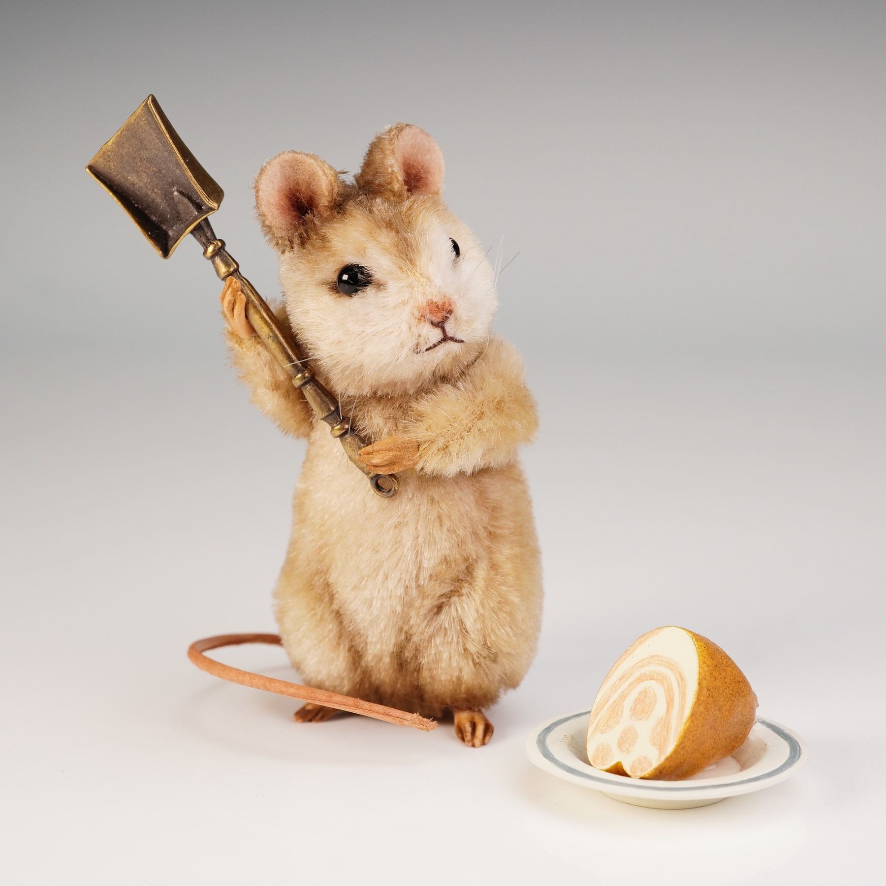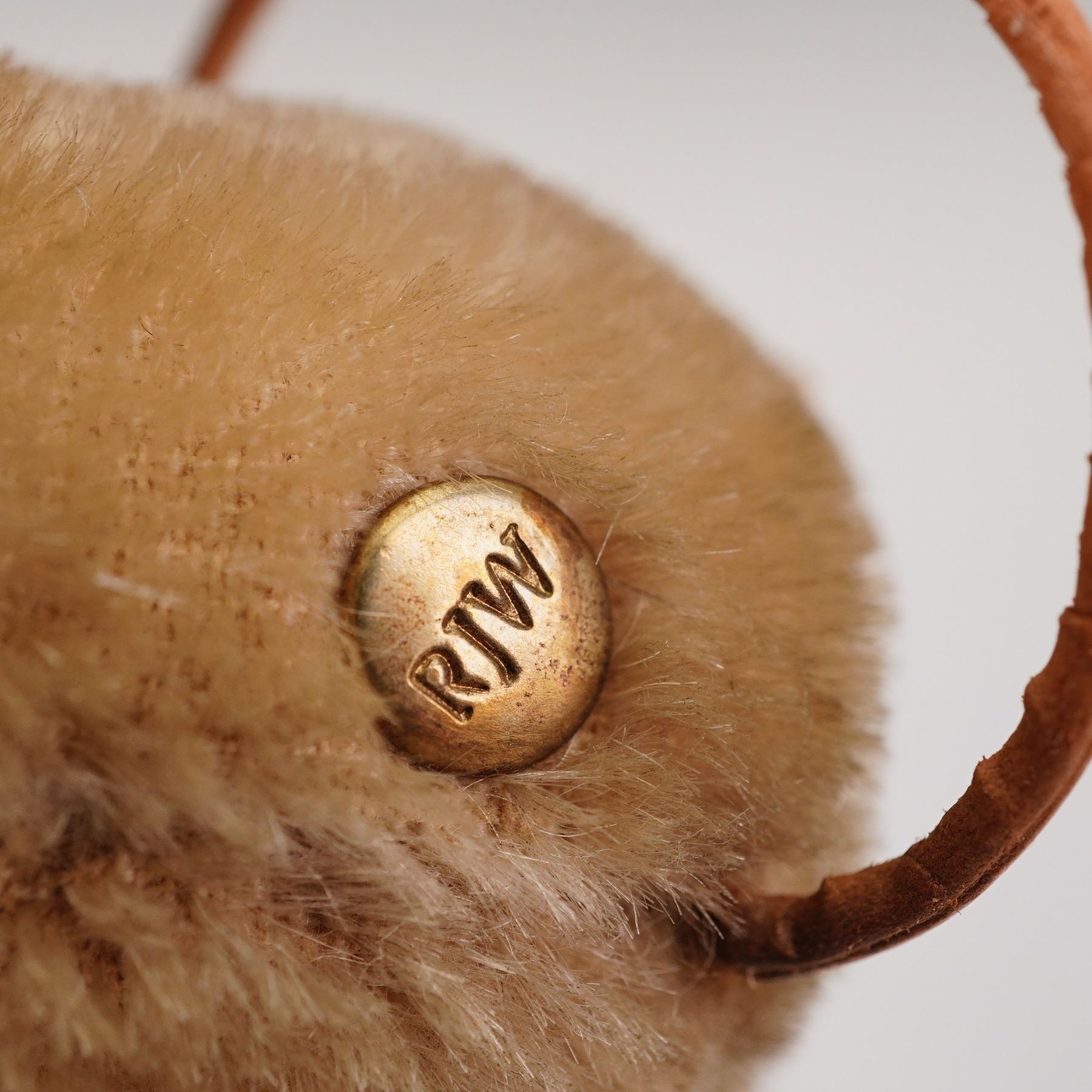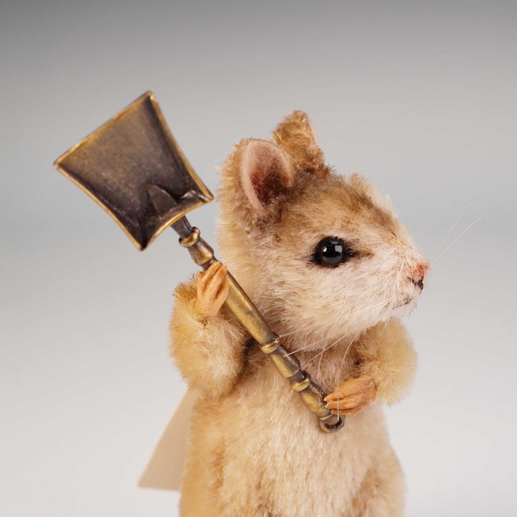 This finely crafted R John Wright collectible from the Beatrix Potter series depicts Tom Thumb, the charming mouse character, holding a miniature brass shovel and accompanied by a detailed slice of ham on a porcelain plate. Made with mohair plush, resin hands, feet, and tail, and glass eyes, this figure showcases R John Wright's exceptional craftsmanship and attention to detail. The underside bears the RJW brass button, and a numbered hang tag identifies this as No 378 in a limited edition of 500 pieces. Includes the original presentation box, Certificate of Authenticity, and related paperwork.