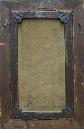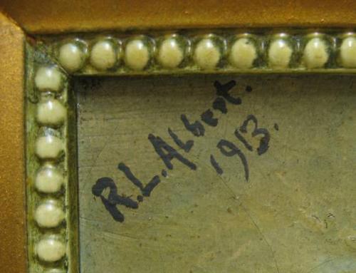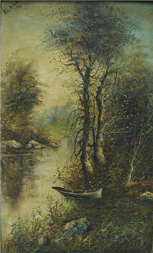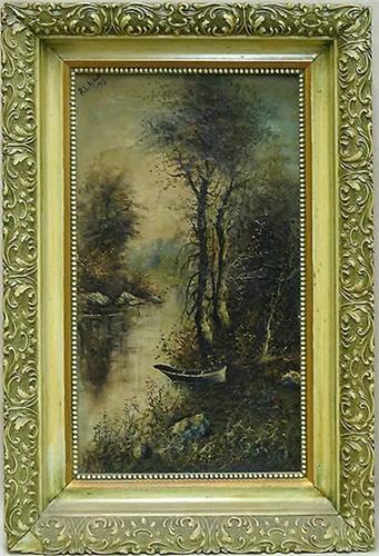 R. L. Albert oil on canvas; landscape with woodland stream and rowboat; signed (U.L.) and dated 1913; framed; image measures 16" x 9" (overall crazing)