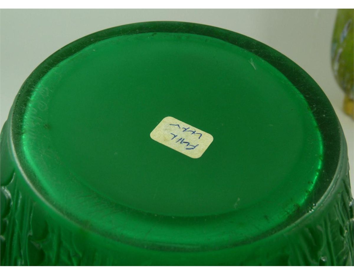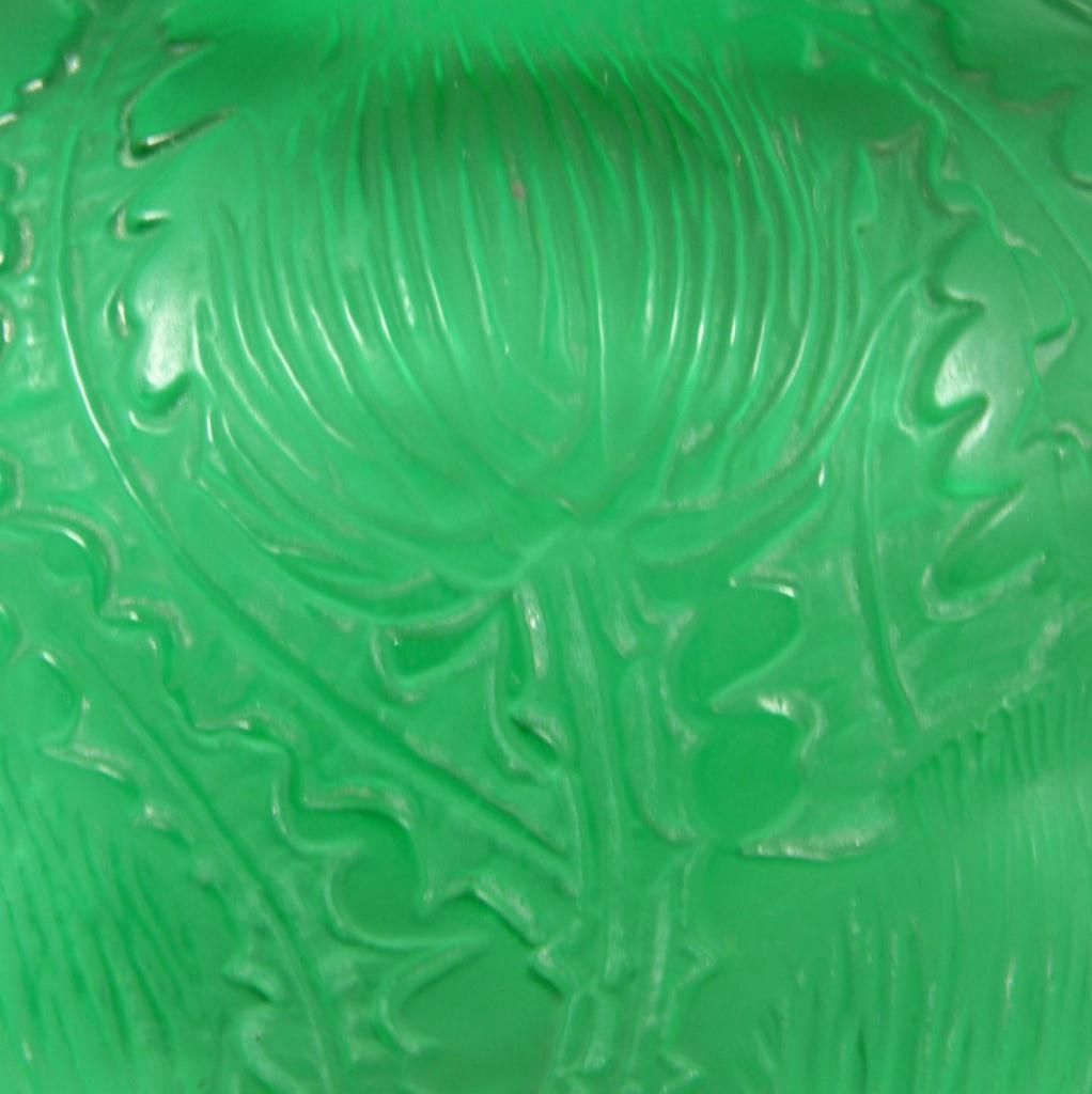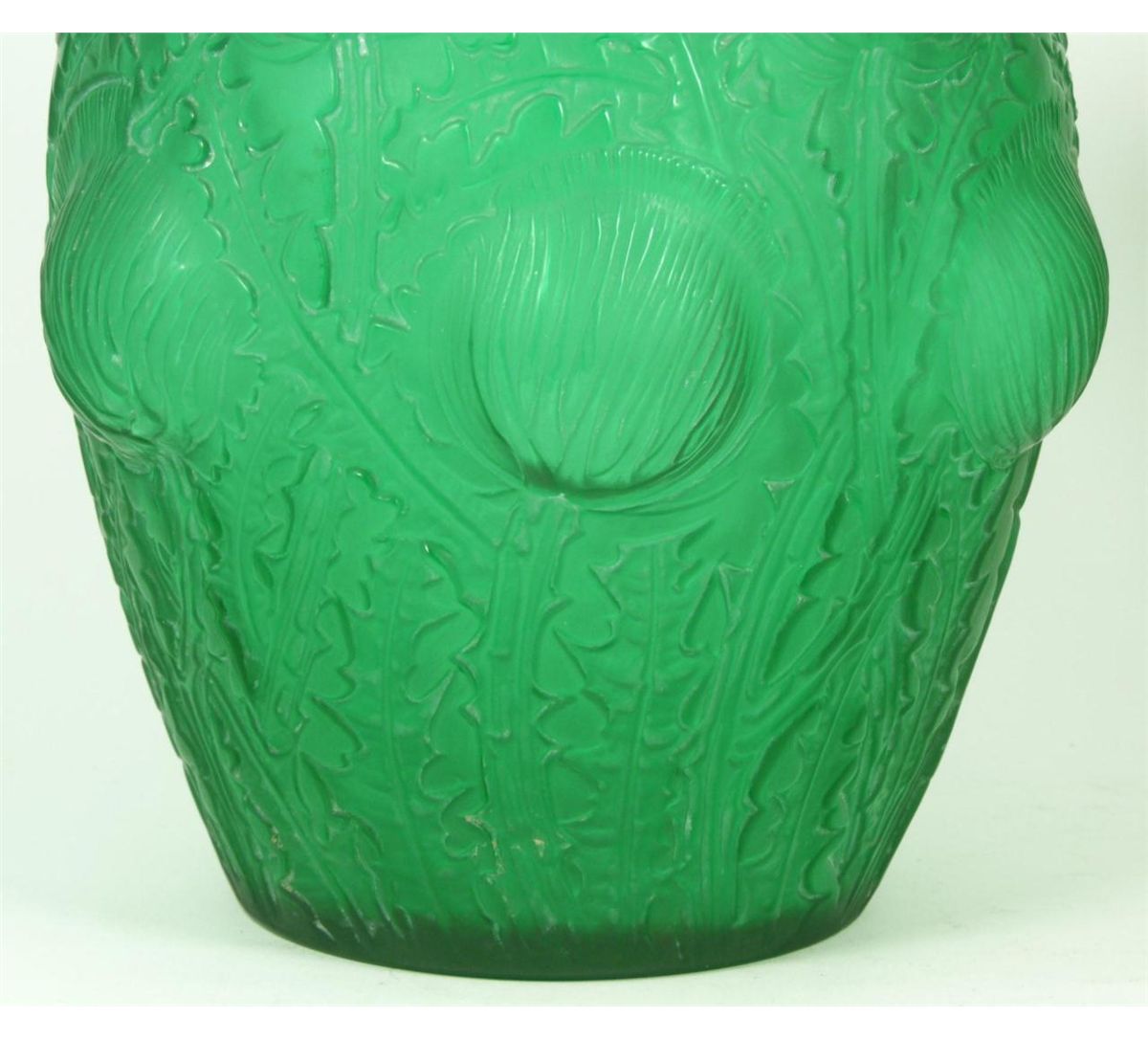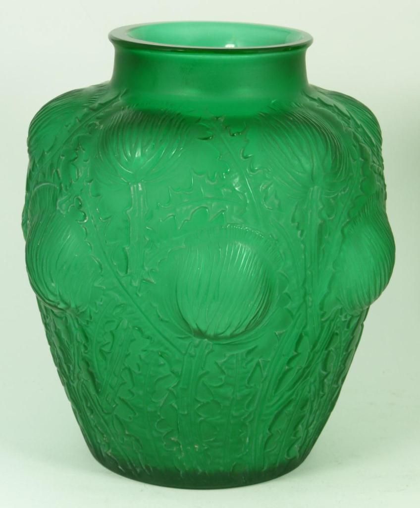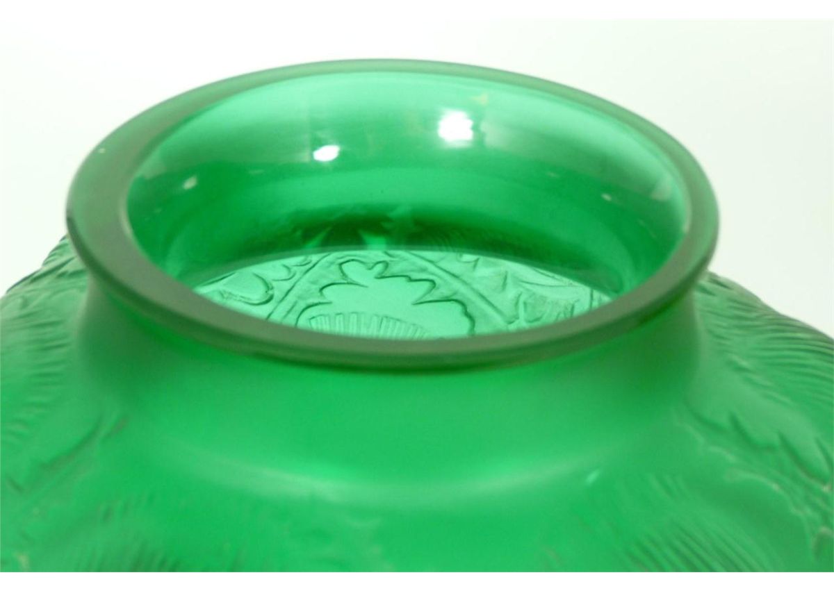 Original Rene Lalique emerald green 'Domremy' vase having raised floral designs throughout. Circa 1926. Etched 'R. Lalique France' script mark with numbering to bottom. Measures 8 3/8" height x 7 7/8" width (21.2cm x 20cm). Total weight of 2083 grams.