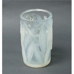 R. LALIQUE - "Laurier." A strongly opalescent glass vase with a relief moulded design of leaves and fruits. 7" high. A 1922 design in F. Marcilhac: "R. Lalique, Catalogue Raisonne," page 427, #947. 1800-2200