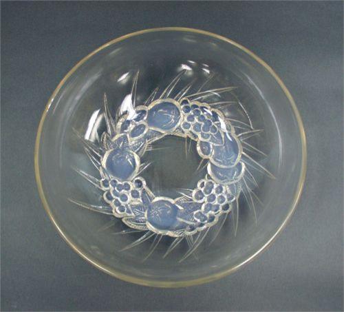 R. LALIQUE - "MONT - DORE. An opalescent and clear crystal bowl. The circular vessel raised on relief opalescent pomegranates and leaves. Signed in relief. 8 1/2" dia. 3" high. Illustrated in F. Marcilhac: "R. Lalique, Catalogue Raisonne", page 296, ill. 396. Modelled in 1928, discontinued since 1947.