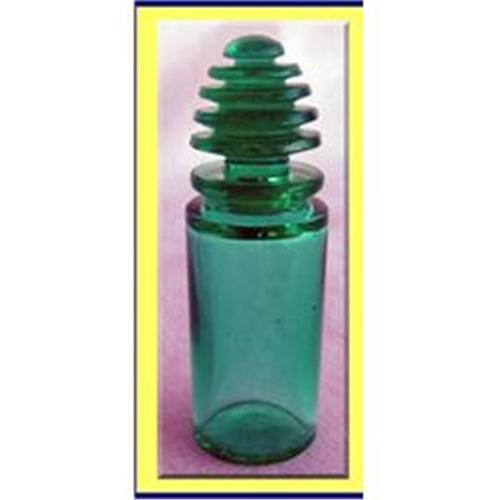 Marvellous emerald green glass. Tubular shaped bottle with top oulded like a series of beehives, one above the other in decreasing size.