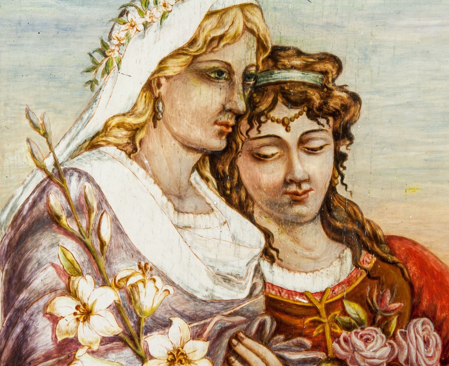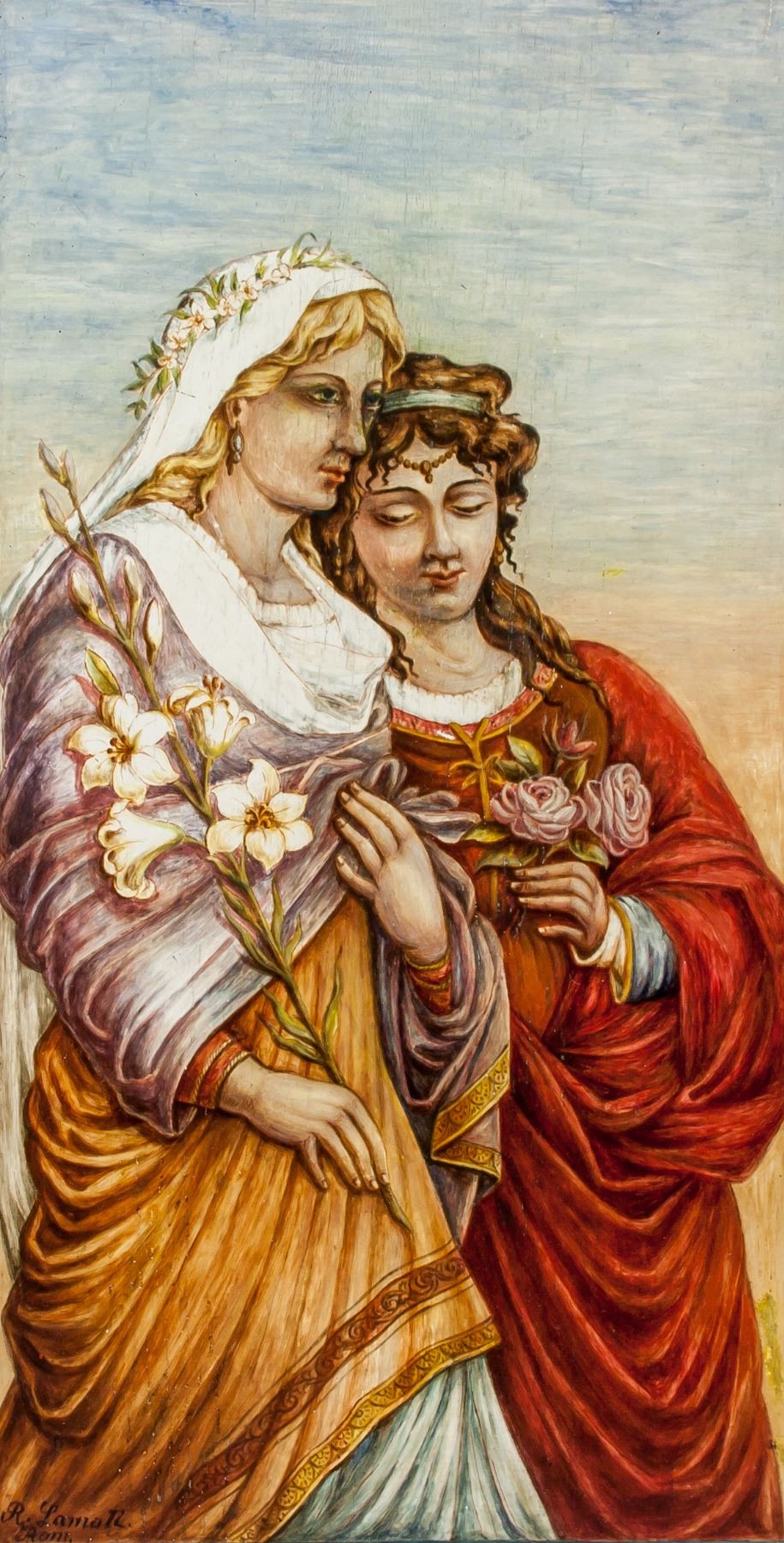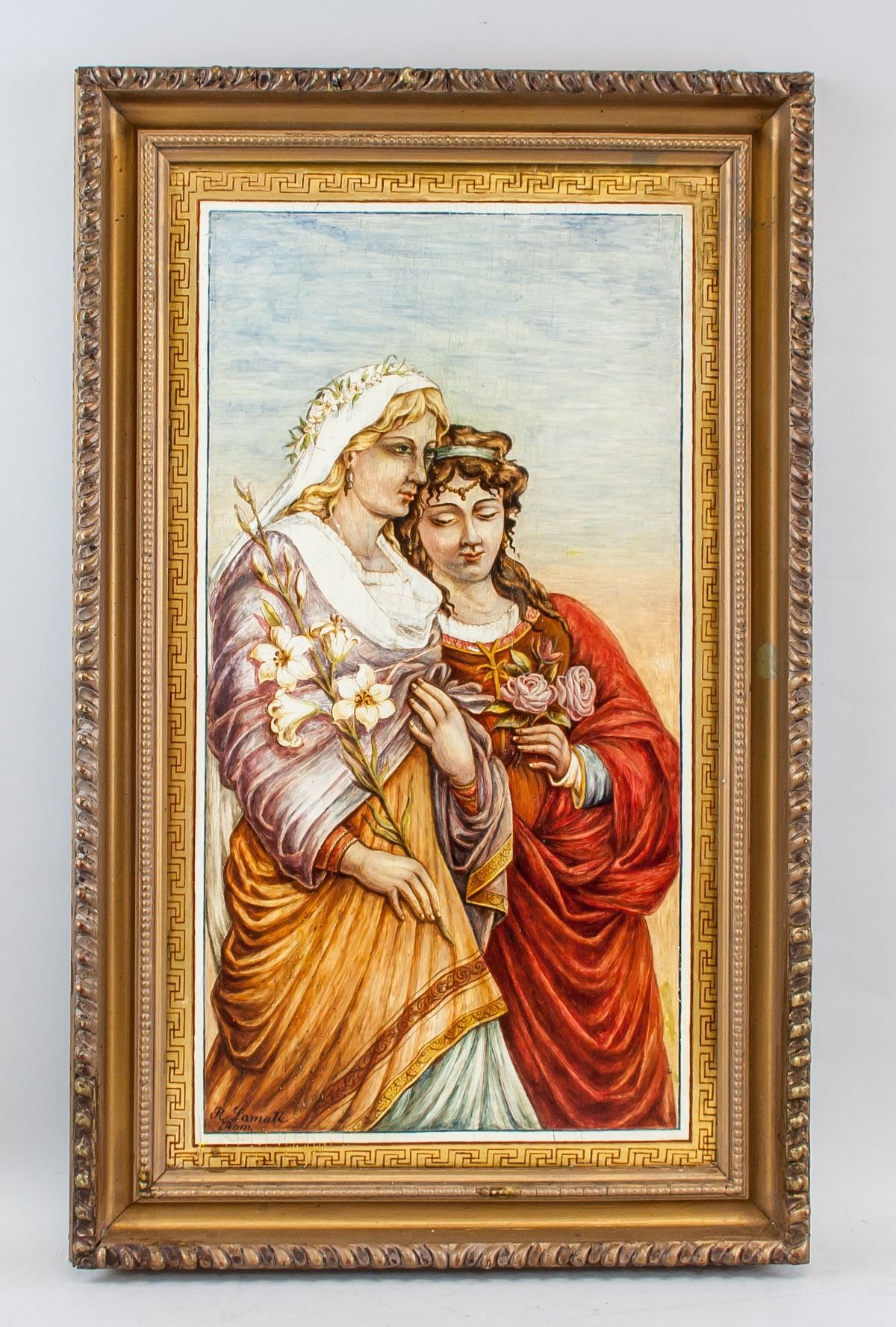 Oil on board, framed. Featuring a portrait of two ladies. Signed "R. Lamar" on the lower left corner. 57 x 31.5 cm (22.4 x 12.4 in.)