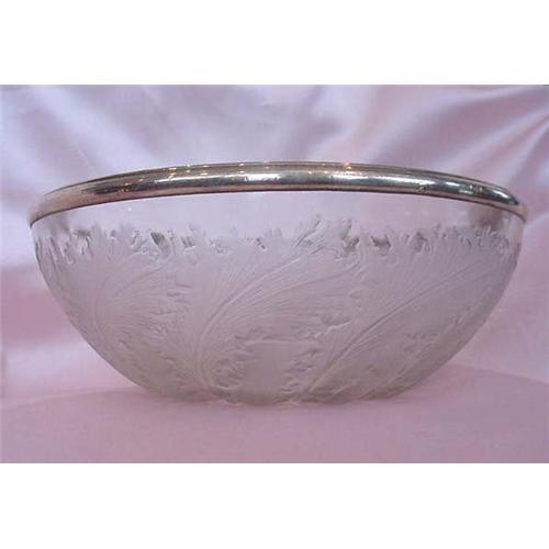Lovely Rene Lalique molded bowl with a slightly raised and frosted leaf motif and a sterling silver rim. The bowl measures 9 1/2" in diameter and is 35/8" high. It is marked R Lalique France in the center interior. The condition is excellent. Circa 1920.