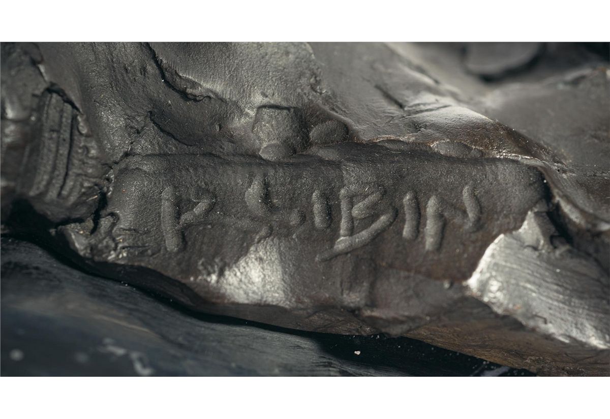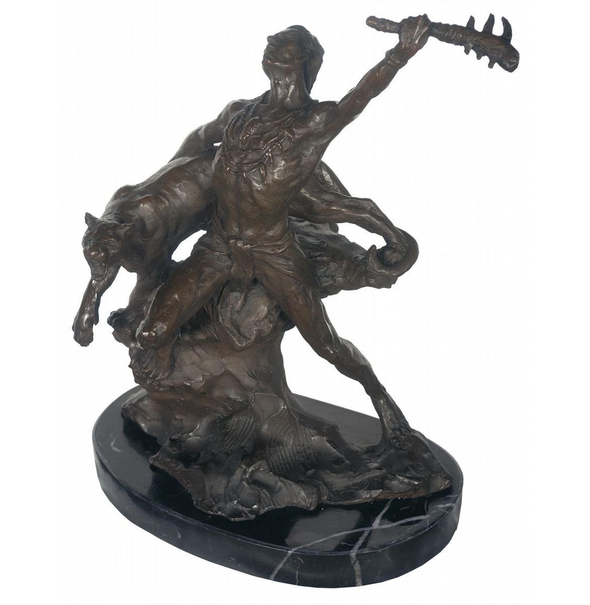 This "R LIBIN" marked bronze depicts a Native American Indian embattled with a mountain lion. Mounted on a black marble plinth, the sculpture measures 19 1/2 inches tall x 14 inches wide x 9 1/2 inches deep and weighs approximately 40 pounds.