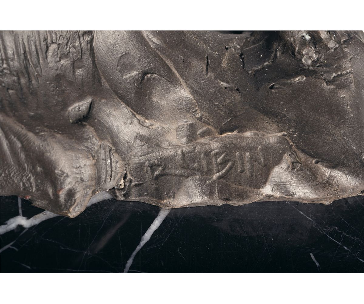 Measuring 22 inches tall and 13 inches wide on a 1 1/2 inch tall oval black marble plinth, this bronze is signed "RLIBIN" on the front, and depicts a Native American in a fight with a mountain lion. Weight is approximately 40 pounds.