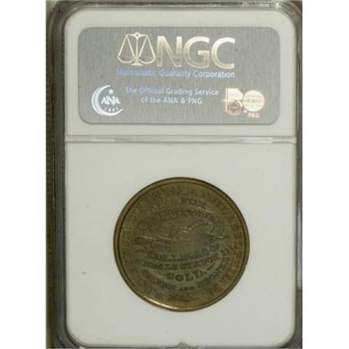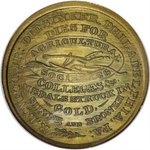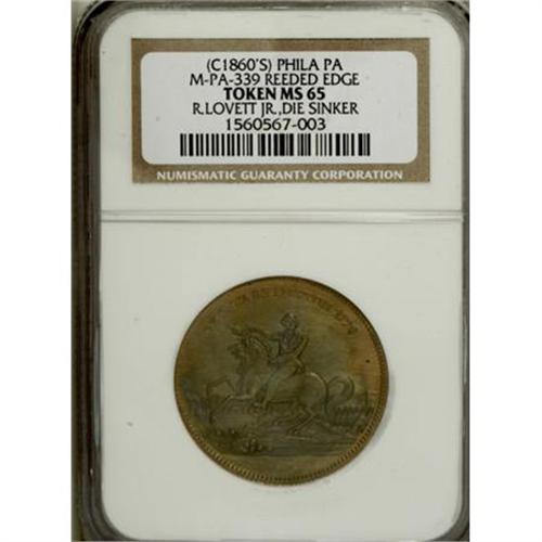 <B>(1860s) R. Lovett Jr., Philadelphia, PA MS65 NGC.</B></I> Miller-PA-339. Baker-556B, R.6. Struck in brass with a reeded edge. Caramel-gold and olive-green toning graces this satiny example. Washington's knee and the scroll beneath the plow show moderate indifference of strike. The fields are striated, as produced.<BR><BR><b>Shipping:</b> Coins & Currency (<a target="_blank" href="http://www.heritageauctions.com/common/shipping.php">view shipping information</a>)