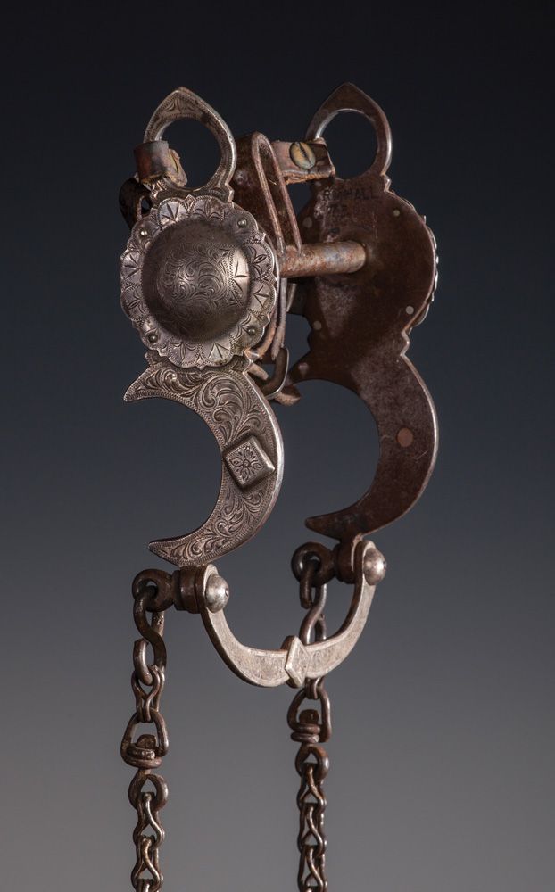 R. M. Hall Half-Breed Bit. Artistically constructed and engraved Bob Hall , Jolon, California, maker-marked silver overlaid crescent moon pattern California bit with 2" scalloped conchos on the cheeks and original rein chains. Excellent condition, circa 1980s. PROVENANCE: Dick Powell Collection, Casa Grande, Arizona