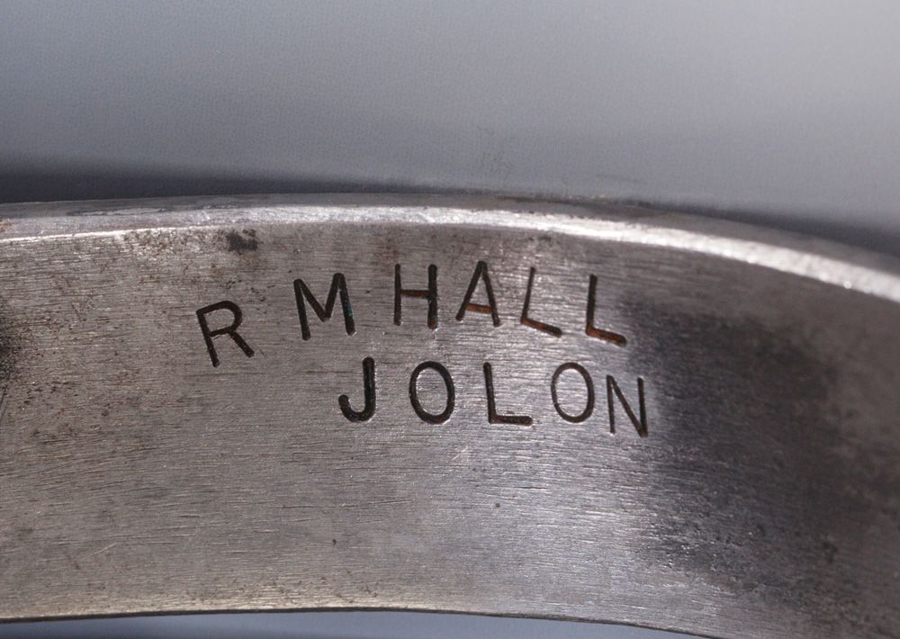 R. M. Hall - Jolon Spurs. Silver mounted Swan neck parade spurs. Beautifully engraved on the silver overlay covering the 1" bands. Marked inside each heelband "R.M. Hall - Jolon".