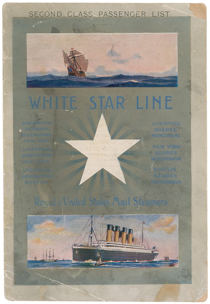 White Star Line Second Class passenger list for the R.M.S. Laurentic, 5 x 7.5, 24 pages, which set sail in July of 1911. Titanic is mentioned twice inside the booklet, once on page 2 and again on page 6, both mentioning the launch of the Titanic on May 31, 1911, and also has seven pages of second class passengers listed inside. In very good condition, with fragile binding, missing top right corner of front cover, partially separated front cover, and scattered toning and soiling.