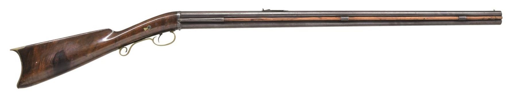 RIFLE. Cal. 38/38. NSN. The round 30 1/2" barrels have a stud front sight and an elevator-adjustable rear sight. Barrels have side ribs, three pipes, and hardwood ramrods. The tops of the barrels are marked "R. M. WILDER COLDWATER MICH". Double Mule Ear action marked "R.M. WILDER" on lock. Walnut buttstock with brass finger curl trigger guard, decorative patchbox on left side, and crescent buttplate. CONDITION: barrels have a considerable blue finish mixed with patina and oxidation, along with a series of vice marks on the sides. Receiver tangs show blue with lock mostly gray patina. Wood has added varnish, several deep impressions, and marks, along with large cracks and small gaps in the wood, to the action fit. Brass shows a mustard patina and verdigris. Good bore with strong rifling and light pitting near the muzzle. (01-24329/MD). ANTIQUE. $800-1,200.