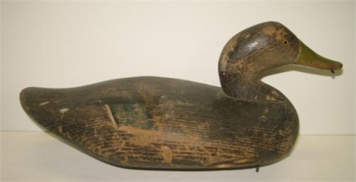 R. MADISON MITCHELL SCRATCH PAINTED BLACK DUCK DECOY. Shows wear and loss to paint. Loss to wood at bottom. Shows crack to wood at neck and at breast. 15.75” L