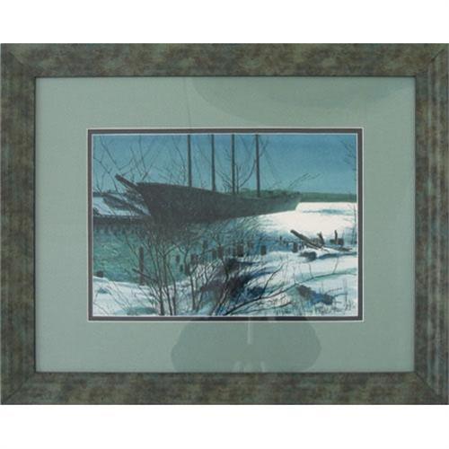 Giclee Print of The Ship by MacIsaac of a ship in a Snowy scene Scene created year 1975 at a size of 32"x32" double matted and framed signed by Robert MacIsaac