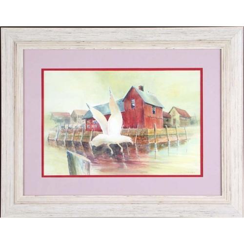 Realistic and beautiful watercolor painting by Robert MacIsaac (dated 1981).Vivid colors and great perspective draw the eye into this fantastic composition.Wonderful attention to details throughout the work.The piece is double matted with a bottom mat of red and a top mat of pale rose. The frame is a gorgeous white weathered wood.size of 27 x 21. Robert Mac Isaac was born in Detroit, Michigan in October of 1925 where he began to foster his significant artist talent. He spent much of his professional career in Novi, MI where he gained recognition for his beautiful landscapes and maritime activities of Michigan . He was also a renowed graphic designer. His work can still be viewed in the seal of the city of Novi. Robert was a decorated World War II veteran and produced many exemplary and vivid pieces up to his death in Clearwater, FL in December of 2000. A letter of provenance is provided.