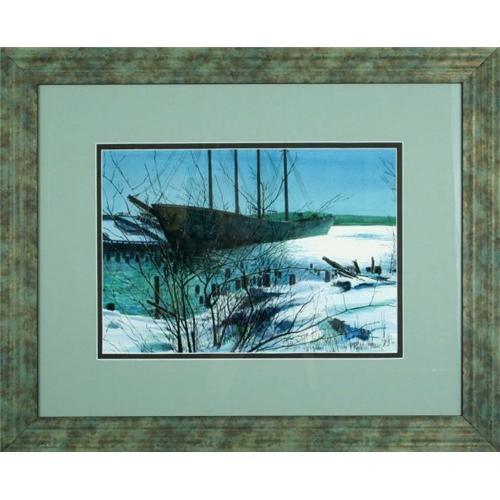 The rays of the sun dance vividly on the water around a solitary ship in this delightfully and expertly rendered watercolor. Robert MacIsaac, a former Michigan resident, masterfully captures this winter day on the water with his mixture of cool colors to bring this painting to life. The use of the smooth, cool tones ...