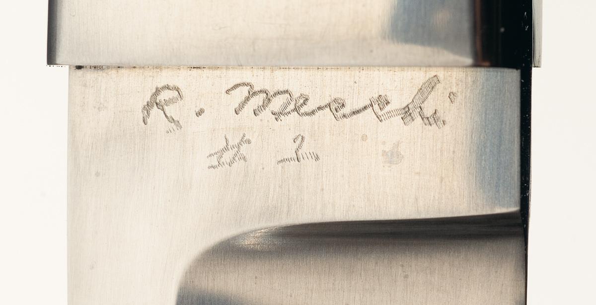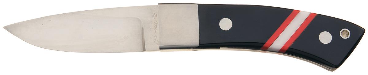 The blade is 4 inches long and marked in script "R Mecchi / #1" in electric pencil. At the time of description R. Mecchi remains unidentified. Further research could provide some interesting results. Fitted with synthetic scales inserted with red and white bands. There is a lanyard hole. OAL: 9"