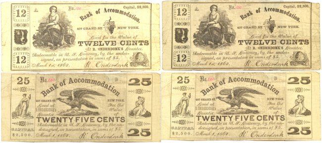 Pair of rare March 1st, 1862 dated scrip notes redeemable at their "Bank of Accommodation". Includes rare and unusual 12 cents note and 25 cents note from the same series. Rare and unusual NYC scrip. Both fine or better.