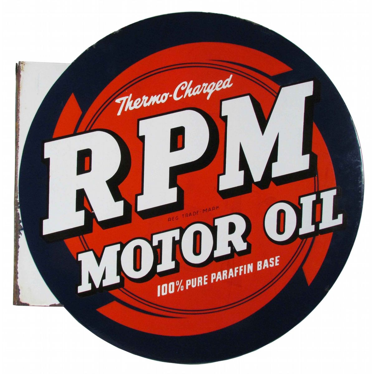 R.P.M. Motor Oil Porcelain Flange Sign. Paint loss at flange edge only, excellent condition. 22 inch diameter.