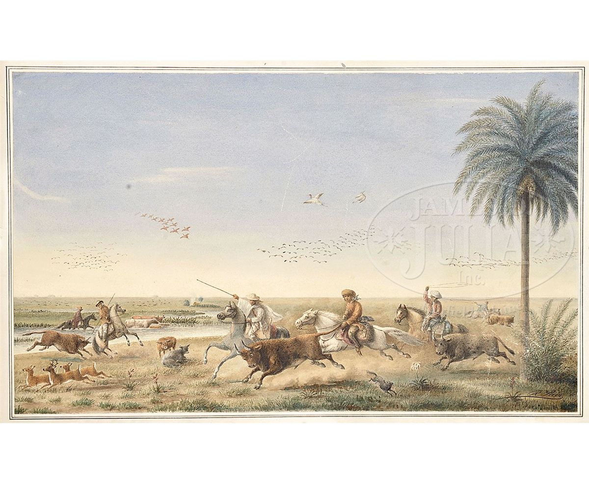 R. PAEZ (Argentinian, 19th Century) HERDING BULLS ON THE PAMPAS