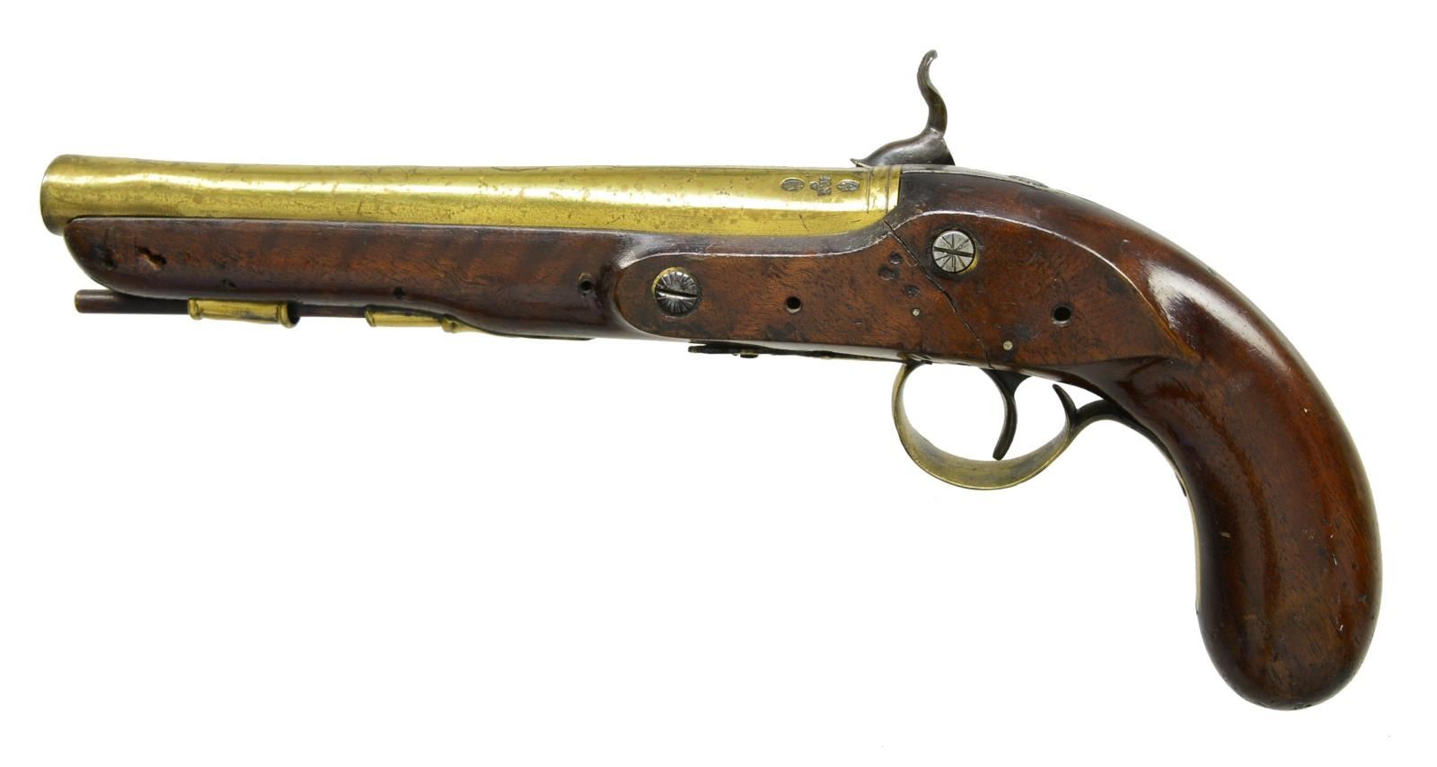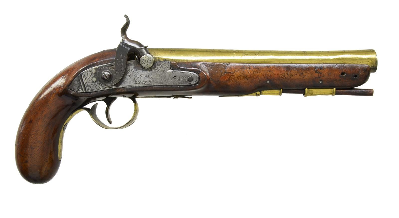 Cal. 60. NSN. Bbl. 8" rnd. brass w/ British proofs. Top marked "LONDON". Engraved percussion lock marked "R. S. CLARK / EXTRA". Pinned fastened rnd. butt walnut stock having brass trigger guard, thimble & faceted pipe. Hardwood ramrod. CONDITION: metal parts show cleaning w/ scattered spots of pitting. Stock is broken through sideplate & lock areas w/ added finish over nail type repairs & handing marks. Lock shows wear. Dark corroded bore. (01-18299/DS). ANTIQUE. $300-500.