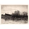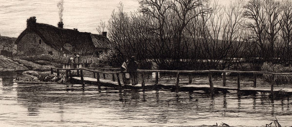 Antique etching on laid paper by Richard Samuel Chattock. "Footbridge over the Wiley". This impression is well more than 120 years old. This is not a modern reprint but was hand pulled from the copper plate 1884. (Image size 7 1/4 x 10 1/2 inches). This print is in excellent condition. Comes with a Certificate of Authenticity.