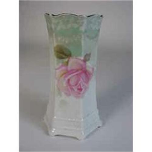 4 1/4 inch Tall ** Beautiful Pink Rose on Pearlized Luster ** Six Sided Mold with Six Small Feet ** Marked with Green Wreath With a Star ** Excellent Condition