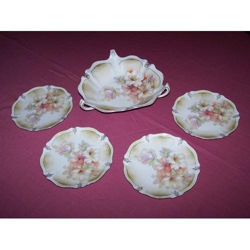This is a very fine R.S. Germany serving bowl with four plates. The bowl measures 10-1/4" in diameter and approximately 3" from the base to the top of the handles. As can be seen it has three handles and a beautiful painted flower design. The plates measure 7-1/2" in diameter. All four pieces are marked R.S. Germany. This set is in fine condition with no chips. There is a slight wear area on two of the painted leaves on the large bowl and some of the gold painted trim around the outer rim is worn off on all pieces. It detracts very little from the appearance.