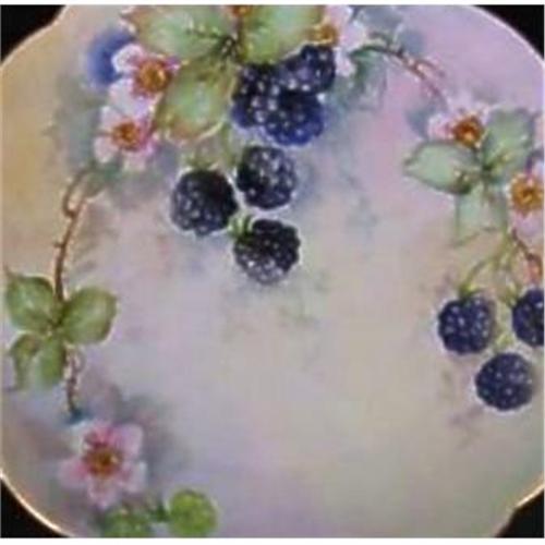 Superb artist painted R.S. Germany porcelain blank two handled cake or pastry plate in a fruit motif of blackberries, blooms and foliate. Richly burnished gold adorns the open tab scroll handles and rim. Plate measures 11 inches in diameter and is rated to be in near perfect condition with only minor age related base rubbing and less than 10% gold wear. No hairlines, cracks or chips noted.<p>Per an article by Lee Marple, 'R.S. Germany/Suhl Seminar', dated 1.06.2006, this mold was introduced by Schlegelmilch in 1910 after the close of their Suhl factory. Acquired from a well preserved and extensive Estate collection of R.S. Prussia and related porcelains.