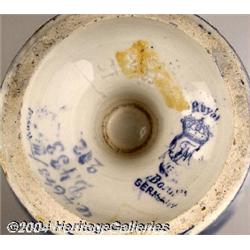 R. S. Prussia: <B>A CONTINENTAL PORCELAIN HANDLED VASE (Royal Bonn) </B></I><BR>Royal Bonn, c.1890<BR><BR>The white soft paste porcelain with gold gilt highlights on handles and hand painted with classical lady holding a water pitcher in a forest setting, stamped with signature under glaze <I>Royal/Bonn/Germany</B></I> and engraved artist's initials <I>CT</B></I><BR>13.3in. high <BR><BR><B>Important notice:</B> Heritage usually auctions material at the rate of 200-250 lots per hour. On some occasions eBay Live bid software or the Internet may not be able to keep up with the pace of the auction. We recommend placing a realistic absentee bid now as insurance to avoid disappointment. Occasionally the auctioneer may eliminate or reject an eBay Live bid, and the auctioneer may also reopen a lot after the close of the eBay live bidding (usually because we missed an audience bid), and may reject your bid even if it shows you as the winning bidder. By bidding via eBay Live, you agree that Heritage may award the lot to another bidder at its sole discretion under the circumstances described above or any other reasonable circumstances. Since eBay bids are not shown to us until we open the lot on the floor, we treat those bids just like floor bids. In most cases the floor responds before the eBay bid is presented to us, due to Internet lag time, so for consistency we have made it a policy that floor bids are always considered first over tie eBay live bids. Also please note that all Heritage lots purchased through eBay Live carry a 24.5% Buyer's Premium. Please make sure you read the Terms and Conditions before you bid.