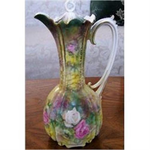 Gorgeous RS Prussia chocolate pot, both in mold and motif detail, is decorated in an overall painted and tranfer floral motif. Heavy to muted shading in tints of teal, green, pale and golden yellows. Roses contrast between snowly white and a rich fuschia pink. Embossed mold pattern bead and rippled shell. Ornate two part jeweled edge handle is delicate in design.<p>Pot measures 11 inches tall and rated to be in fine condition, both aesthetically and structurally. Minor rub wear on bottom. Gilding detail to beading, rims and handle is brilliant with 95% intact.<p>Acquired, along with other RS pieces we are currently listing, from an exceptional private collection. Chocolate Pot is shown in Mary McCaslin's 'R.S. Prussia & More, Schlegelmilch Porcelain featuring Cobalt ID and Values, page 234, Row 1, 3rd from left, $500.00 - 600.00.