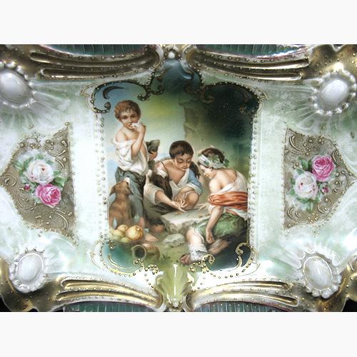 R.S. Prussia celery tray; molded, with jewel medallions; three melon boys in center decoration; green and white ground; late 19th C.; 1" high x 9 1/2" x 5" (slight wear to gilt)