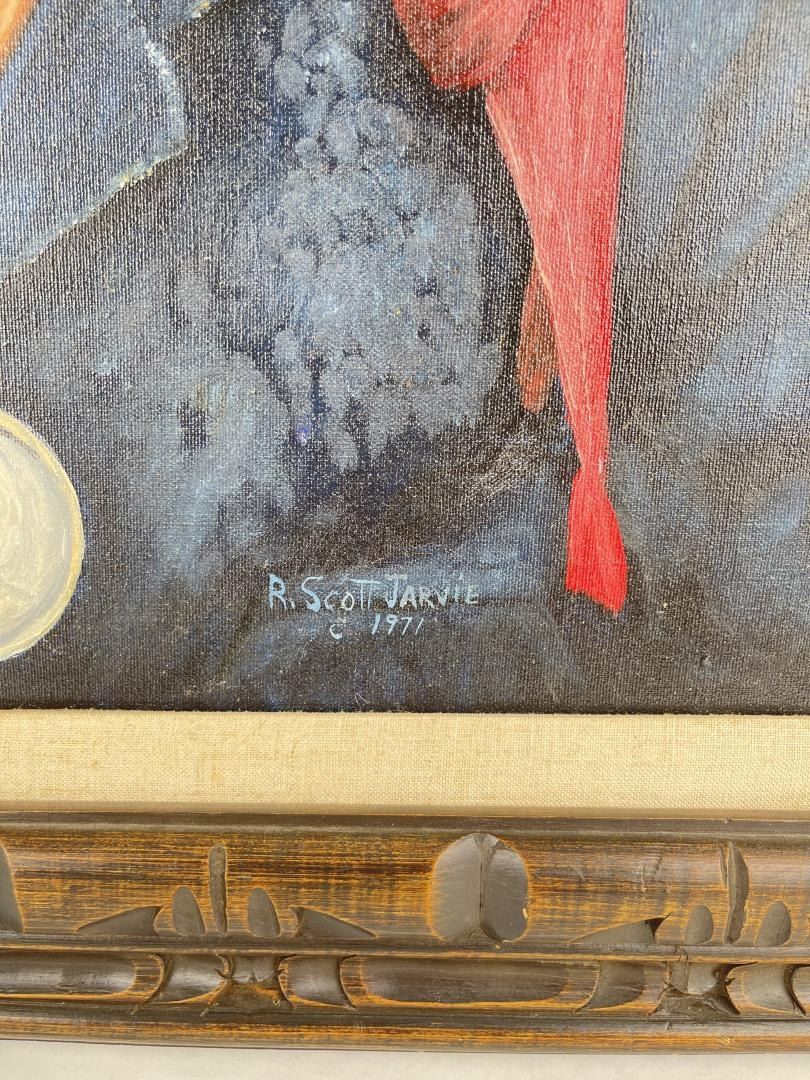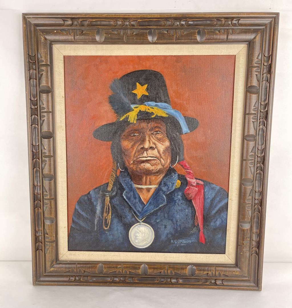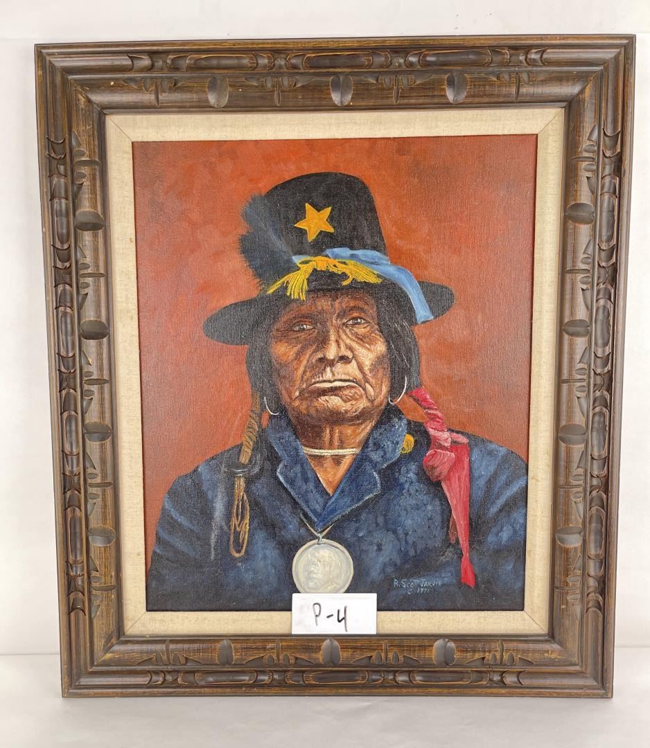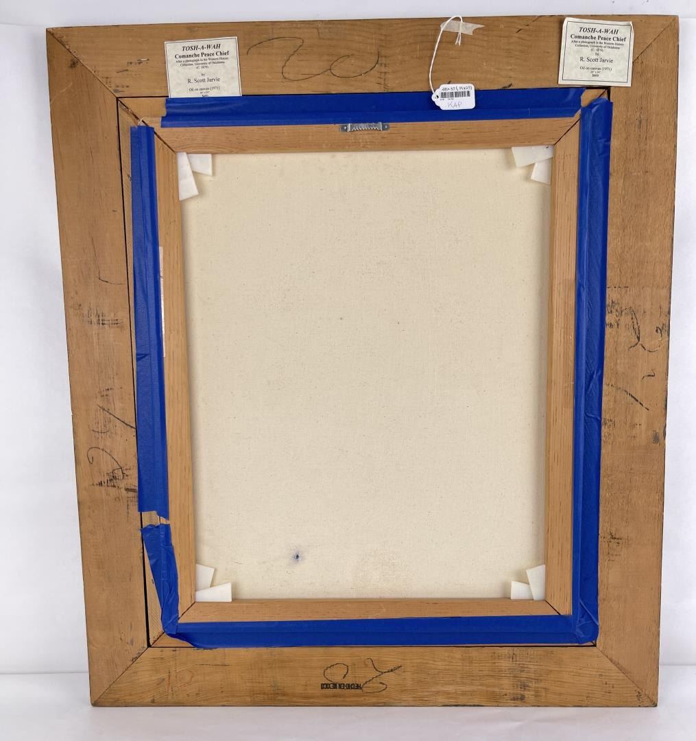 28 1/2" by 32" framed. Title is Comanche Peace Chief. R Jarvie (20th Century) is known for Sculpture. Allard Auction Collection Inv: NO TAG