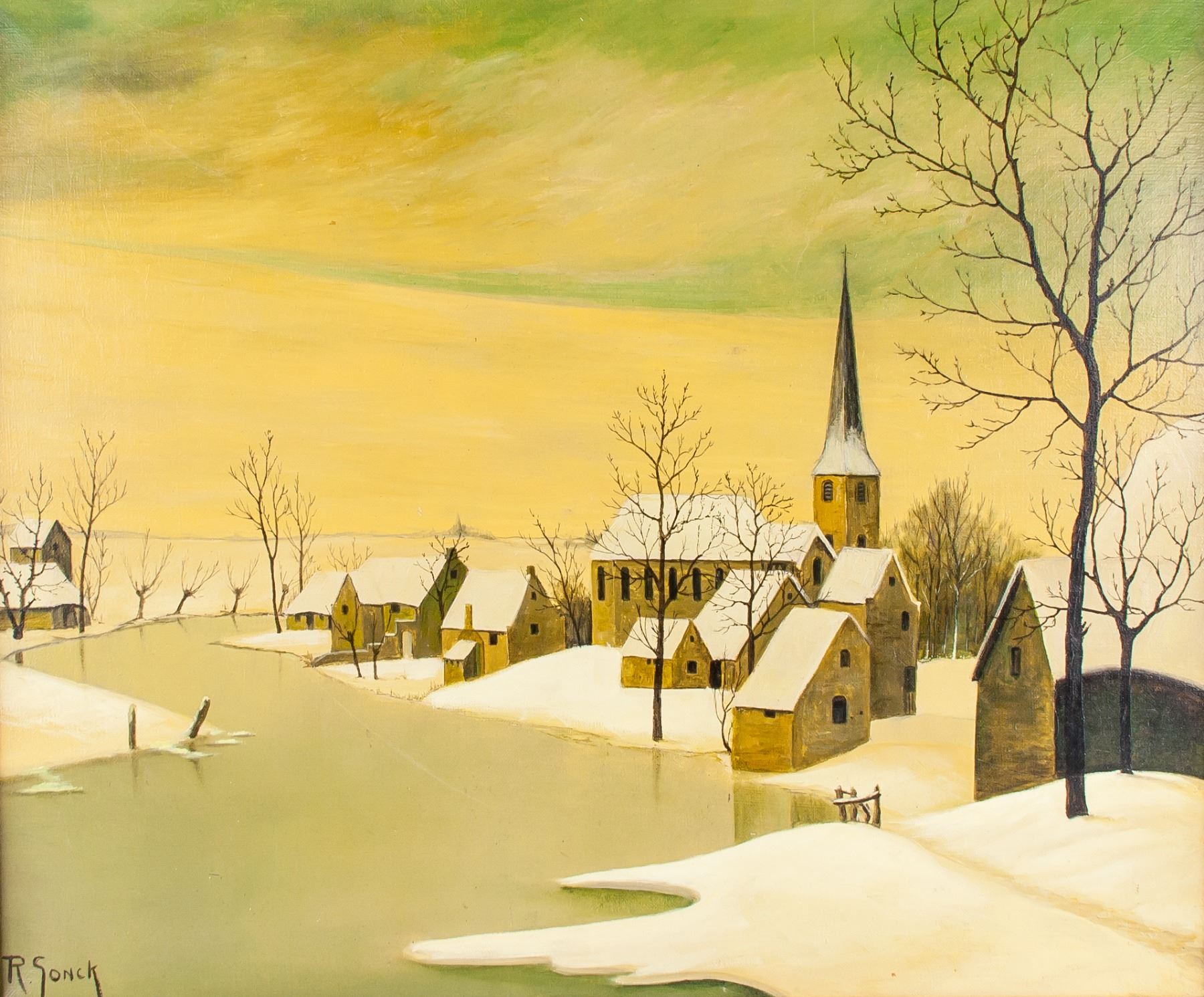 Oil on canvas, winter landscape scene. Signed R. Sonck on lower left bottom . Early 20th century European Dutch School artist. 20 x 23 inch ( 50.8 x 58.42 cm)