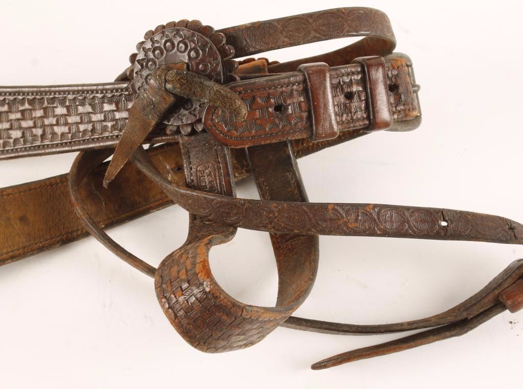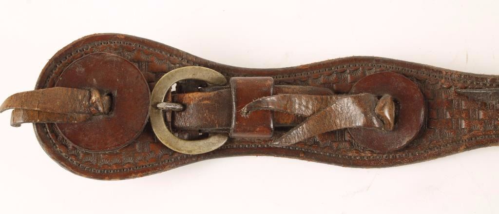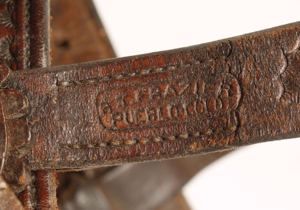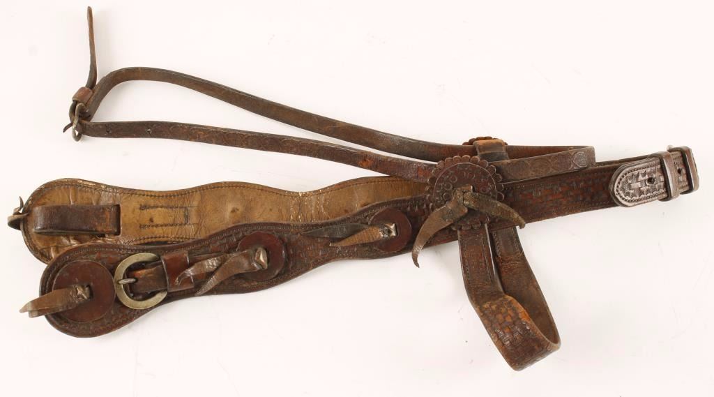 Tooled basketweave design, sunburst stamped conchos, maker marked. Made in Pueblo, CO in fair to good condition.