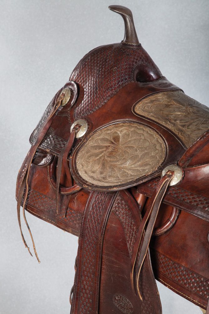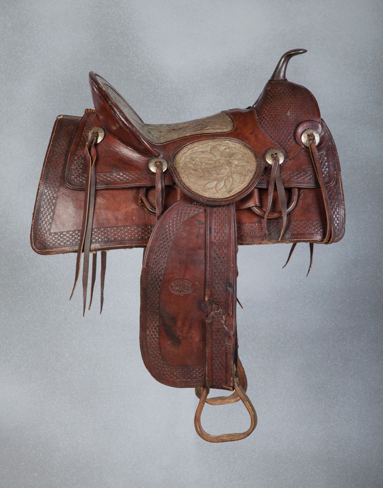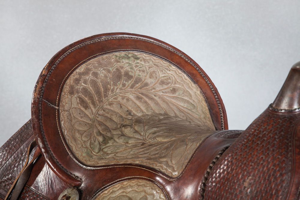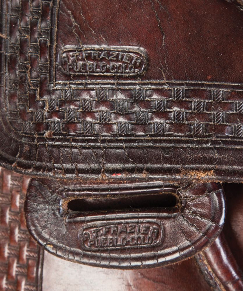R. T. Frazier Ladies Astride Saddle. Multiple saddlery marked with the "R.T. Frazier Maker / Denver / Colo" oval cartouche, this basket-stamped Ladies' Astride Saddle was one of eight models that Frazier pictured in their popular shop catalogs. Constructed on a Denver Citizen nickel horn tree with round skirts, fully hand stitched, buckskin quilted seat, and decoratively stitched and quilted inserts on the jockeys, double rigged, and slotted nickel conchos with latigo strings. Nice vintage light brown color and patina, circa 1920s. .