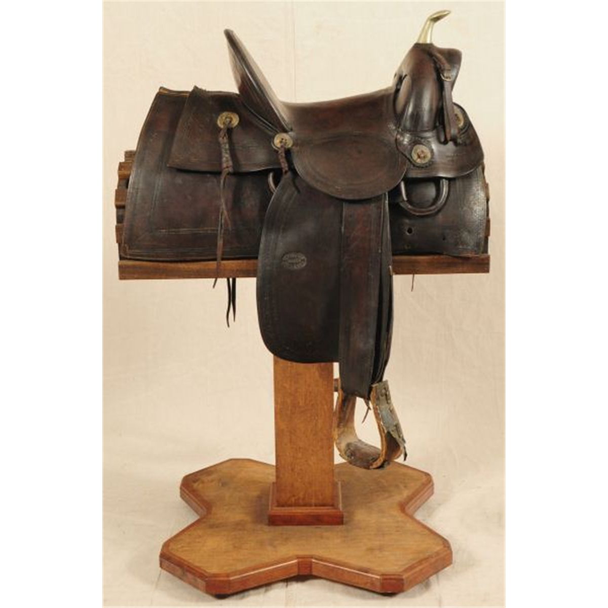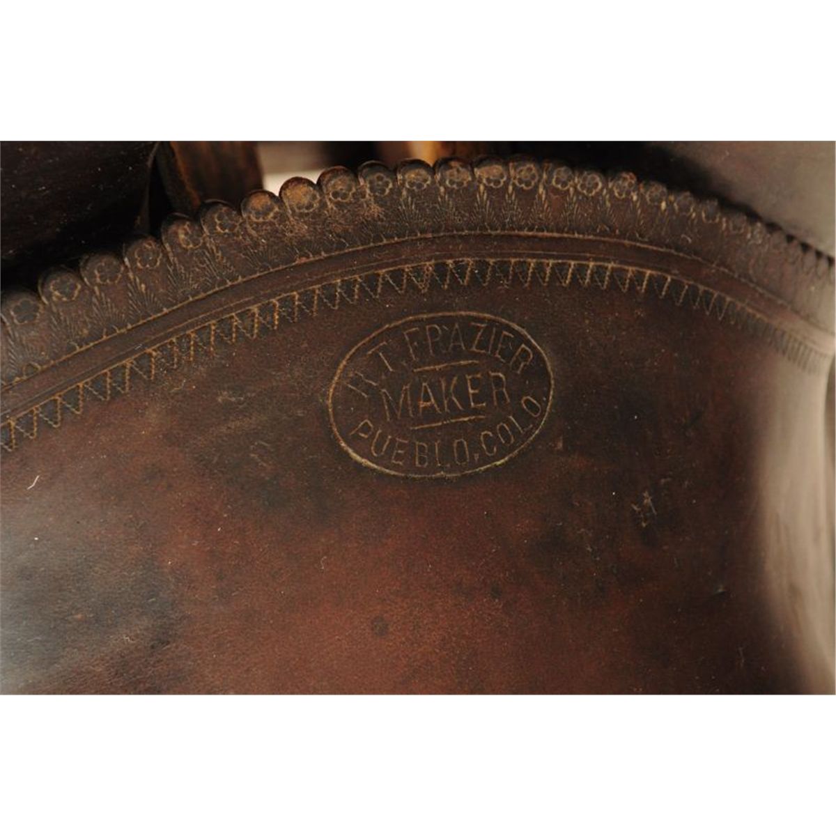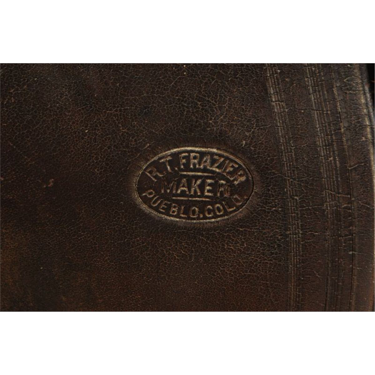 Outstanding circa 1900-20 high back slick forked square skirted border stamped R.T Frazier, Pueblo, Colorado marked saddle. This saddle is marked five times, twice with the early block style “Frazier Pueblo” mark on the front of the top skirt. Fine condition showing signs of period use. This saddle has been on display in the Buckhorn Museum in downtown San Antonio for the last 12 years.