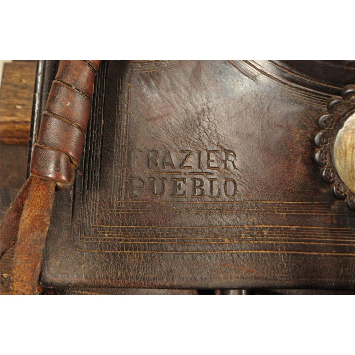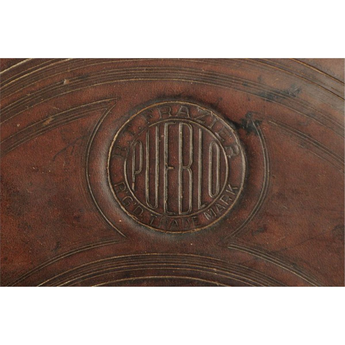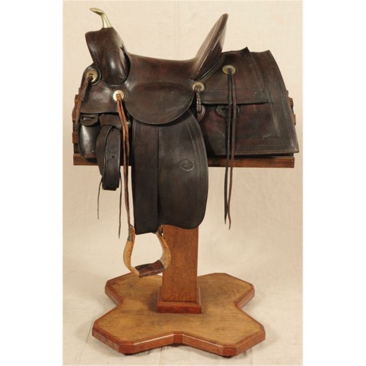 Outstanding circa 1900-20 high back slick forked square skirted border stamped R.T Frazier, Pueblo, Colorado marked saddle. This saddle is marked five times, twice with the early block style “Frazier Pueblo” mark on the front of the top skirt. Fine condition showing signs of period use. This saddle has been on display in the Buckhorn Museum in downtown San Antonio for the last 12 years.