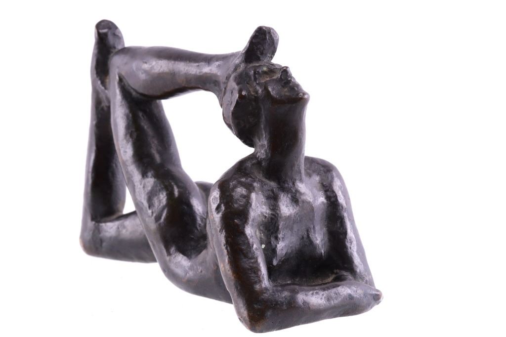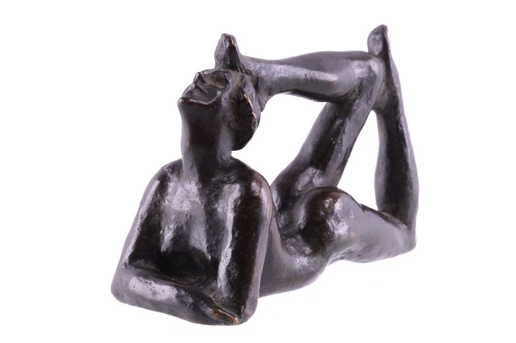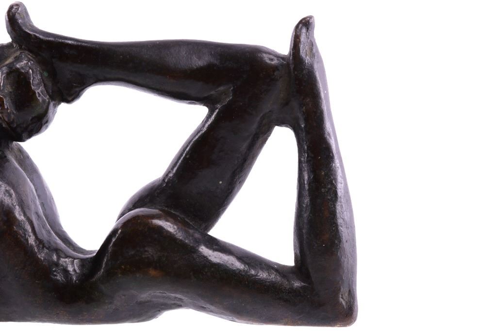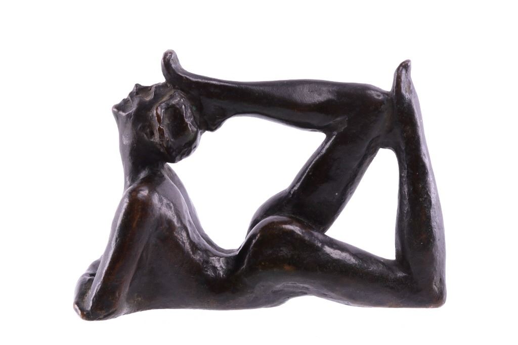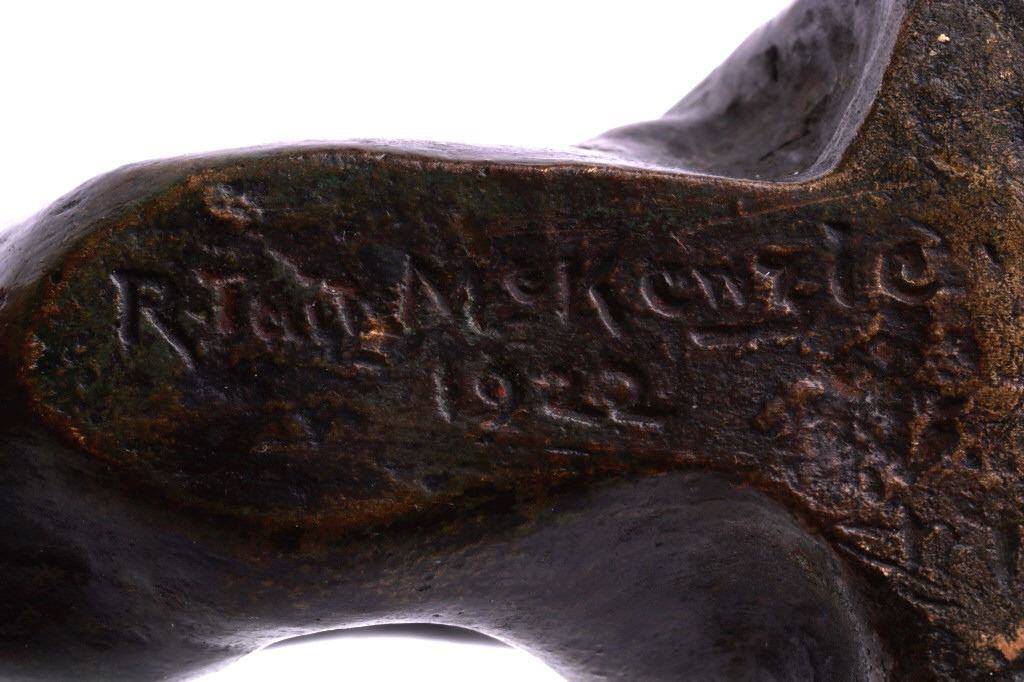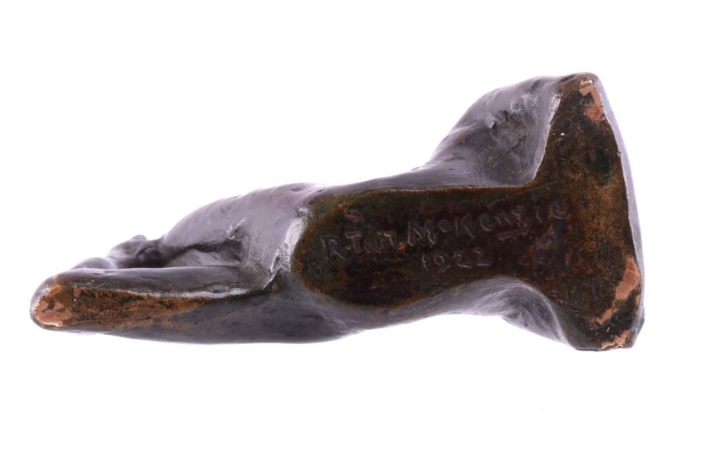 Featured in this lot is a bronze statue by R. Tait McKenzie of a posing woman figure, originating from 1922. Robert Tait McKenzie (1867-1938) was a Canadian physician, sculptor, educator, athlete, and soldier. The sculpture depicts a woman lying on her stomach with her arms crossed and elbows braced on the floor and her legs bent back with one foot touching the back of her head. The statue is signed across the bottom reading "R Tait McKenzie 1922". The bronze shows a dark patina and good condition overall. The statue measures 4" long by 2 3/4" tall.