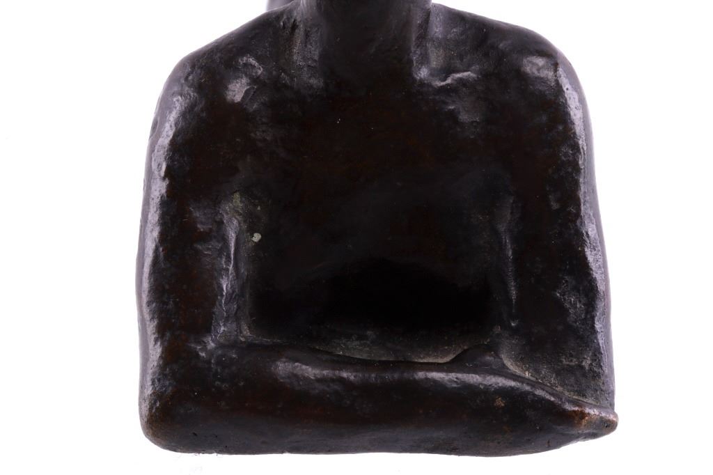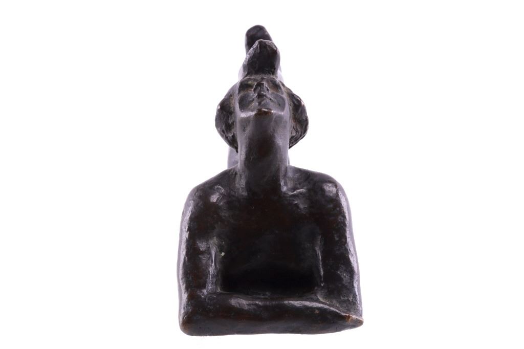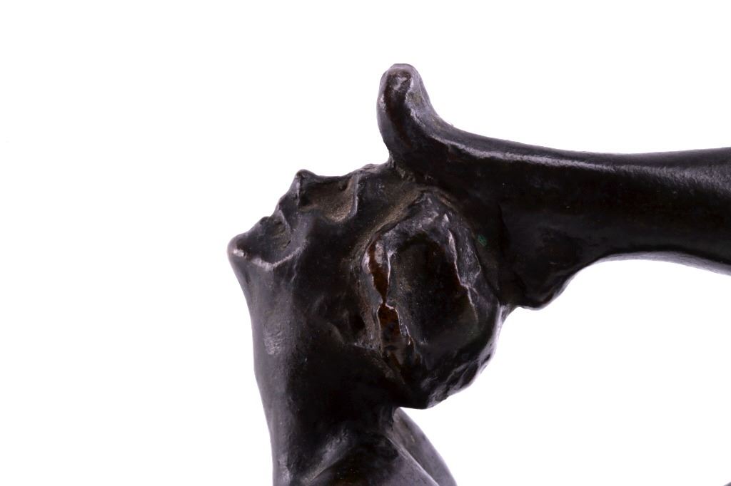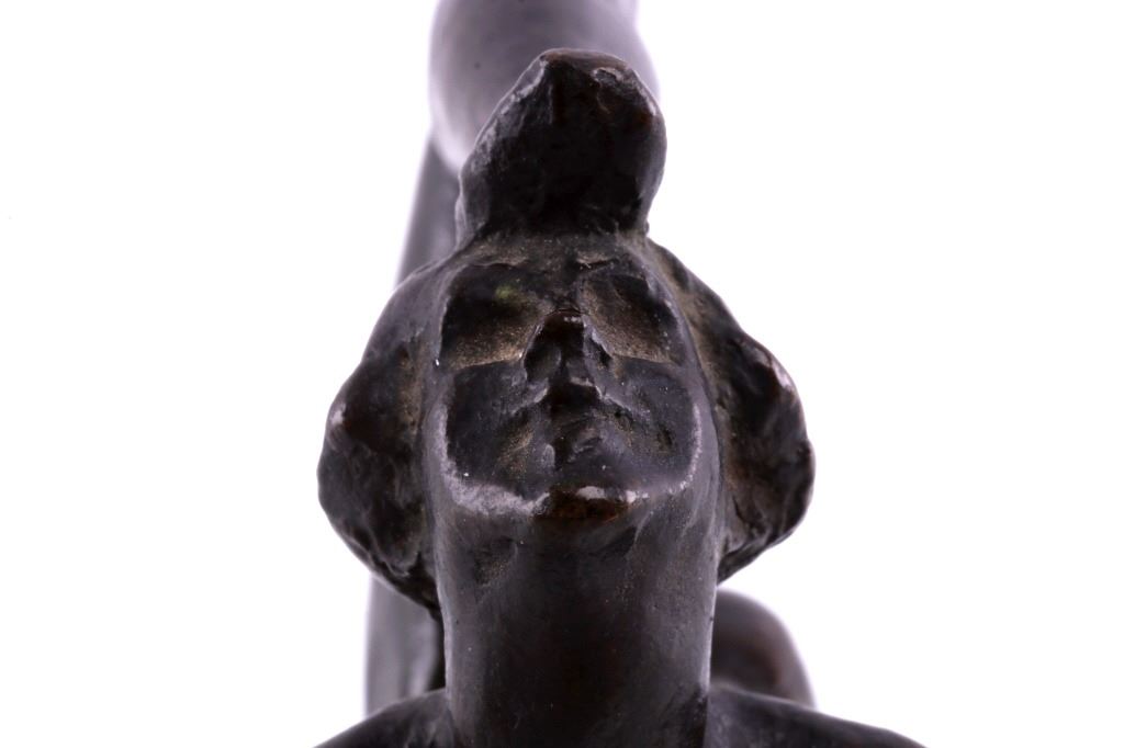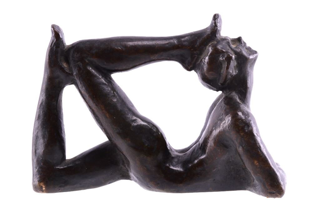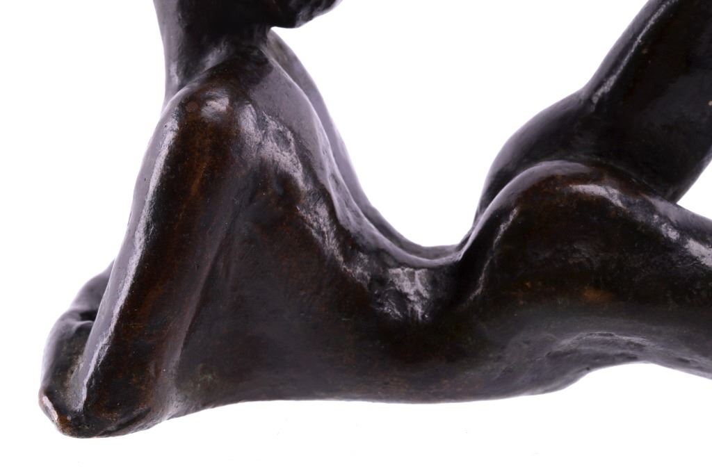 Featured in this lot is a bronze statue by R. Tait McKenzie of a posing woman figure, originating from 1922. Robert Tait McKenzie (1867-1938) was a Canadian physician, sculptor, educator, athlete, and soldier. The sculpture depicts a woman lying on her stomach with her arms crossed and elbows braced on the floor and her legs bent back with one foot touching the back of her head. The statue is signed across the bottom reading "R Tait McKenzie 1922". The bronze shows a dark patina and good condition overall. The statue measures 4" long by 2 3/4" tall.