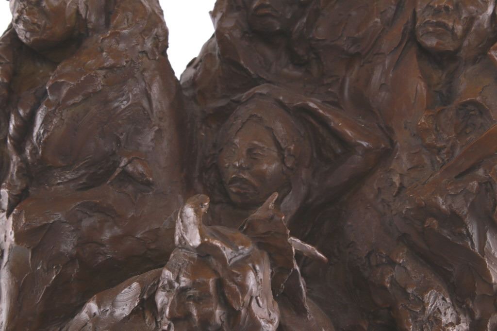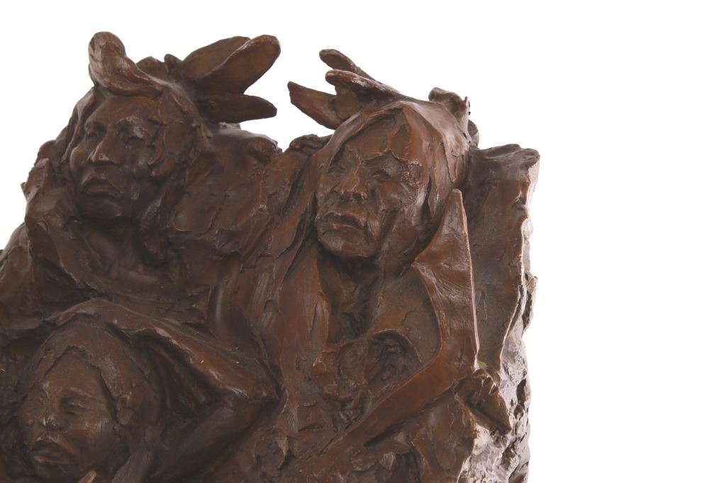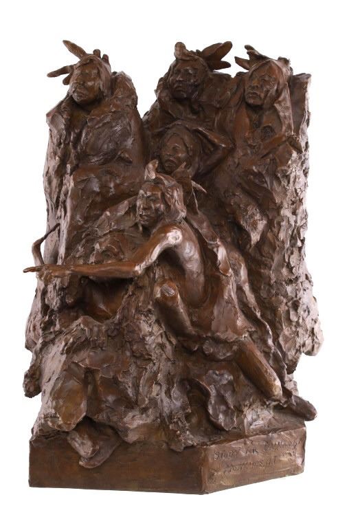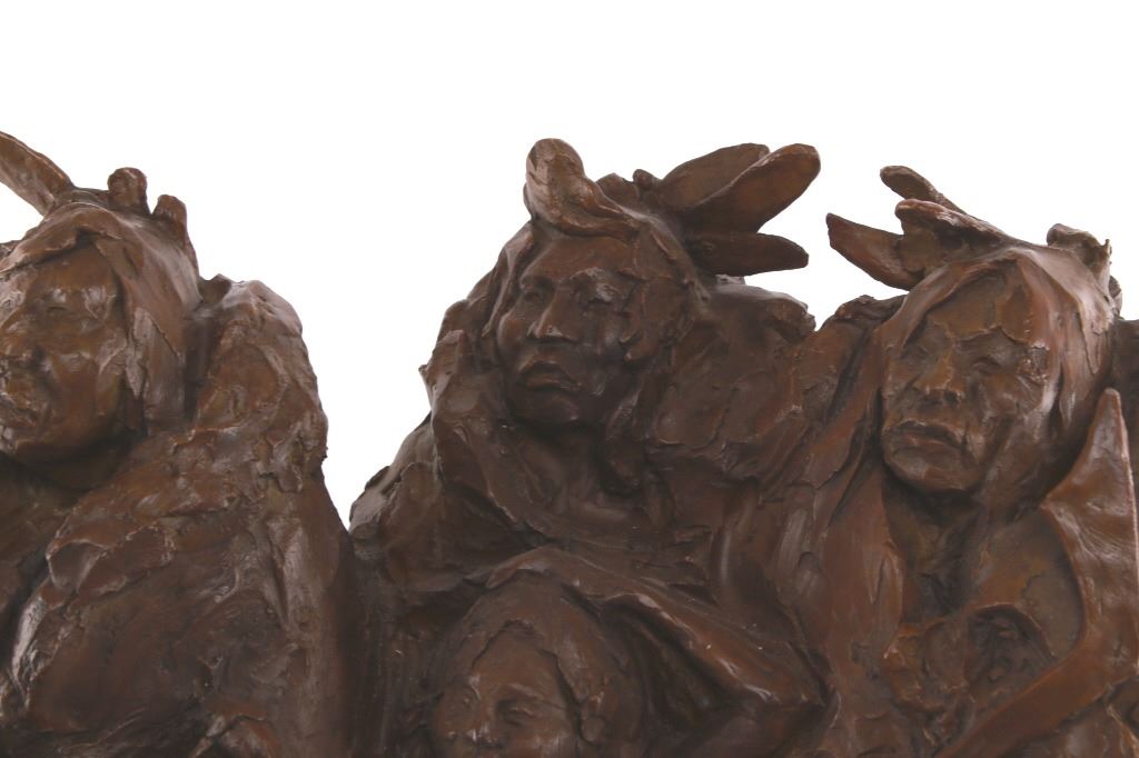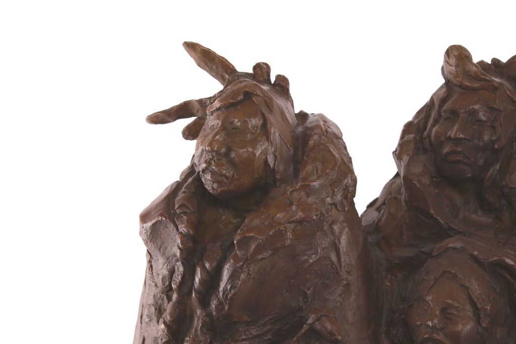Featured in this lot is a bronze sculpture called "Study For Unknown Monument," circa 1984 by artist Richard Vernon Greeves, born in 1935. The sculpture features a wonderfully and professionally crafted bronze construction that shows Native American men and woman sculpted together with some holding war axes and covered in trade blankets and one man pointing out into the distance. The bronze is marked: Study For Unknown Monument - RV Greeves - 1984 - #50. Greeves is a self-taught artist whose work can be found in museums and prominent collections both nationally and internationally. His studios are located in Fort Washakie, Wyoming, and Scottsdale, Arizona. Richard Vernon Greeves (born 1935) aka R.V. Greeves captures the spiritual essence of the people and animals of Western North America. The condition of this bronze sculpture is good with no obvious signs of damage and shows good overall condition. The measurements of this bronze 18 3/4" x 15" x 11 1/2".*