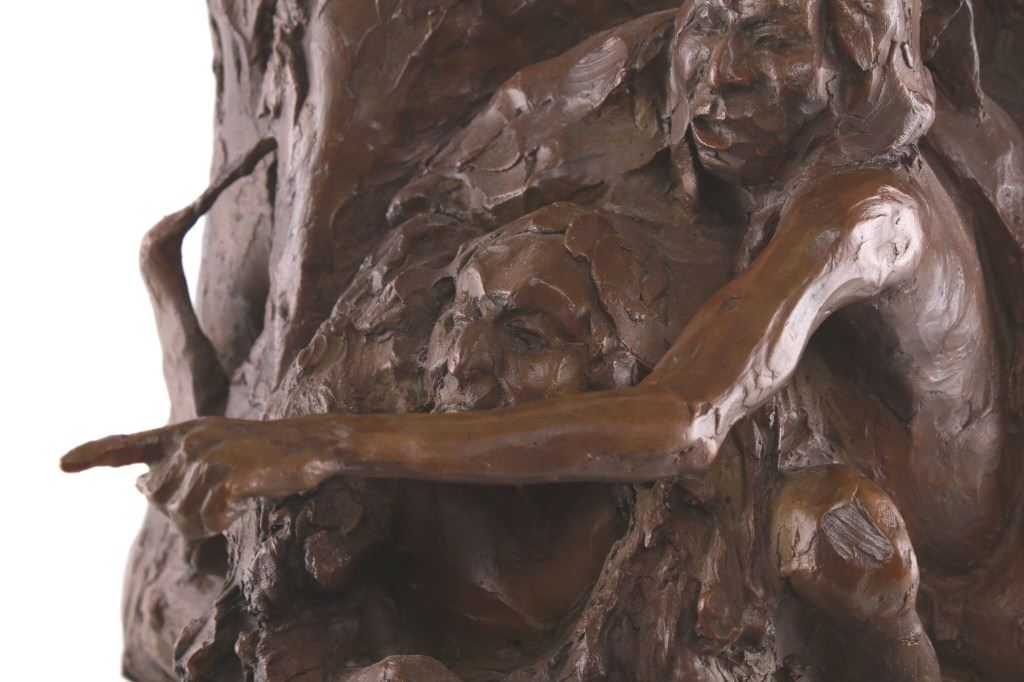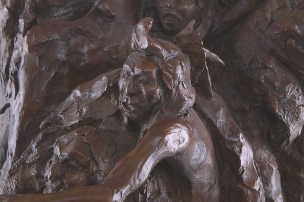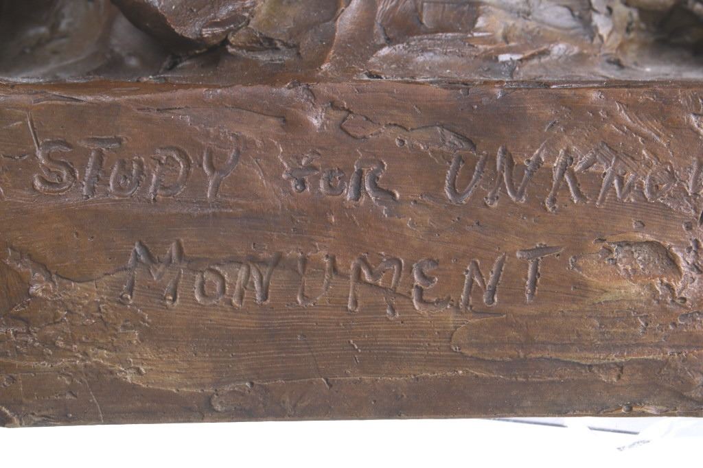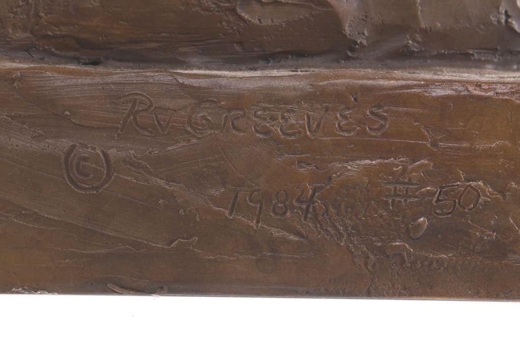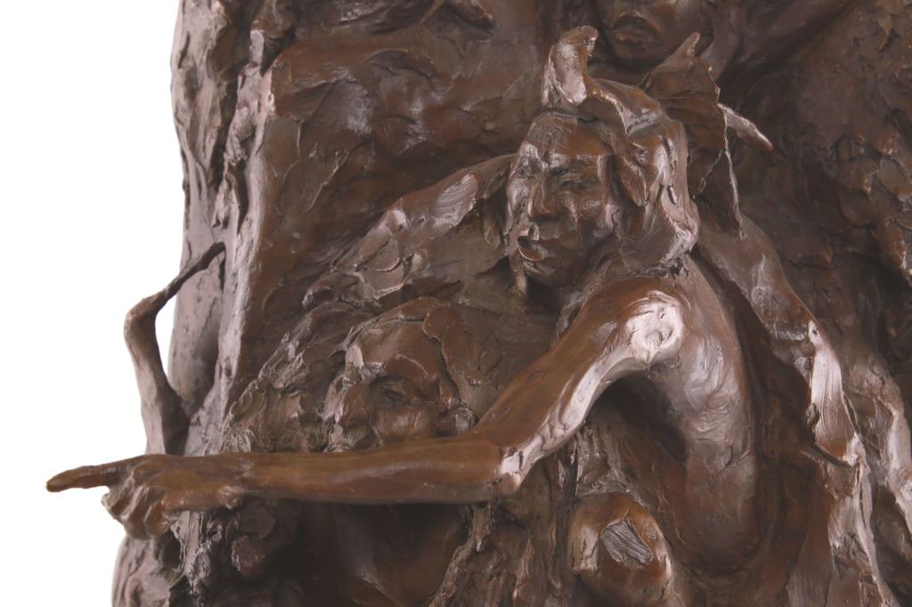Featured in this lot is a bronze sculpture called "Study For Unknown Monument," circa 1984 by artist Richard Vernon Greeves, born in 1935. The sculpture features a wonderfully and professionally crafted bronze construction that shows Native American men and woman sculpted together with some holding war axes and covered in trade blankets and one man pointing out into the distance. The bronze is marked: Study For Unknown Monument - RV Greeves - 1984 - #50. Greeves is a self-taught artist whose work can be found in museums and prominent collections both nationally and internationally. His studios are located in Fort Washakie, Wyoming, and Scottsdale, Arizona. Richard Vernon Greeves (born 1935) aka R.V. Greeves captures the spiritual essence of the people and animals of Western North America. The condition of this bronze sculpture is good with no obvious signs of damage and shows good overall condition. The measurements of this bronze 18 3/4" x 15" x 11 1/2".*