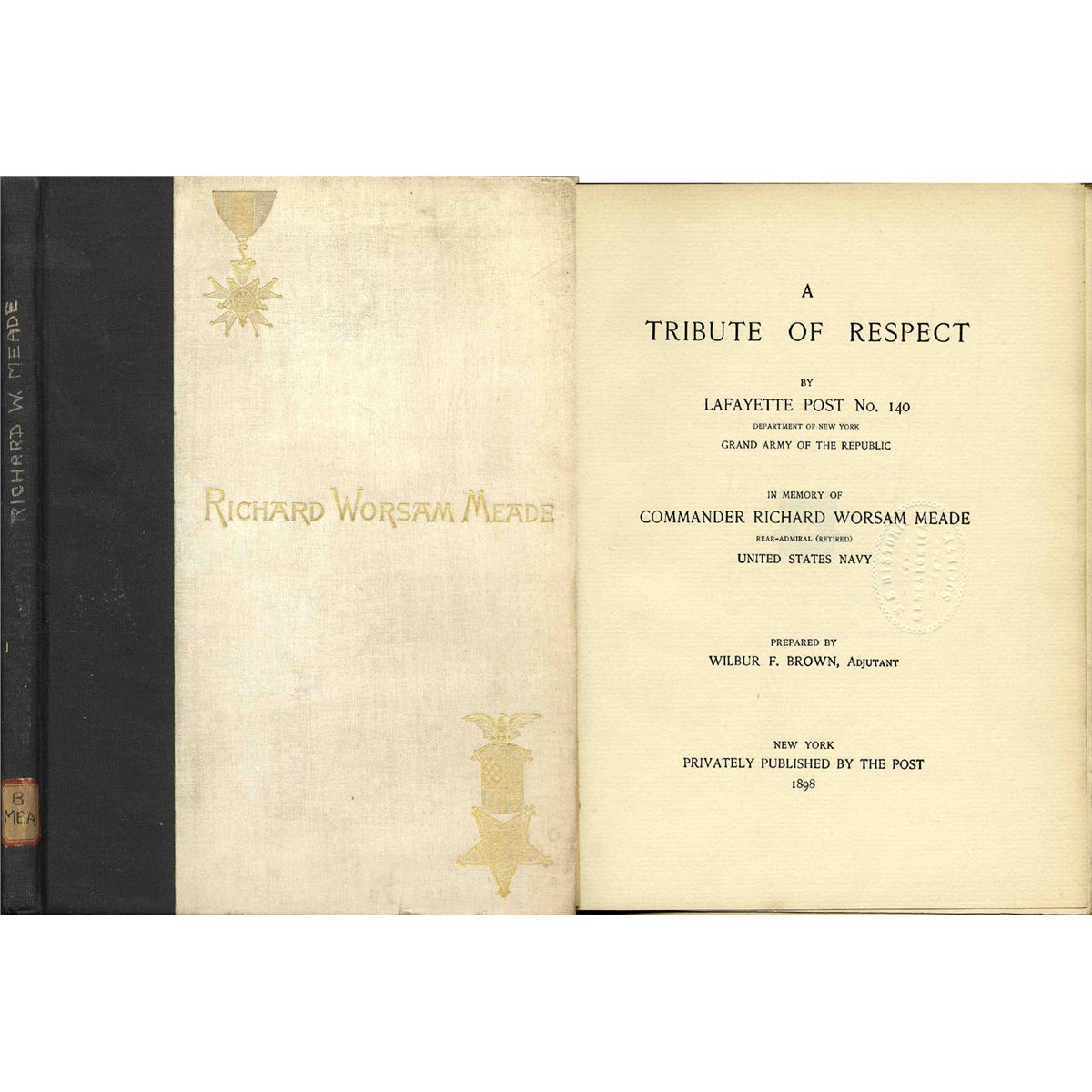 ''A Tribute of Respect: in Memory of Commander Richard Worsam Meade'' by Wilbur F. Brown. New York: Privately published by the Post: 1898. First edition duodecimo hardcover runs 64pp. with two tissued portrait frontispieces. A biography of esteemed Civil War-era Naval Officer Richard Worsam Meade, volume includes Meade's record in the Navy, his notable addresses, plus tributes and eulogies to the departed Officer. Soiling to white gilded cloth boards. Ex-libris copy with label to backstrip and bookplate to pastedown. Good condition.