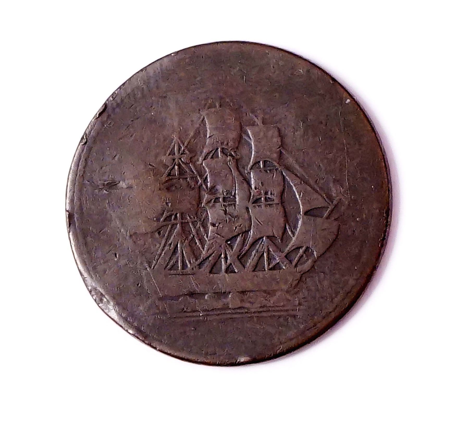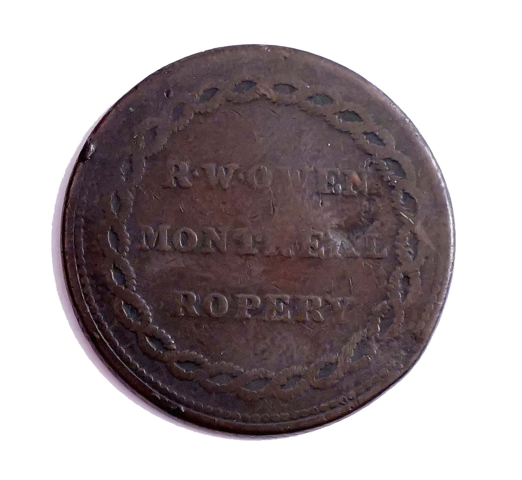 One of the great rareties of the Canadian Breton tokens. Struck in 1824, just before the company sold out to a steam operated competitor. Ah, the march of technology...