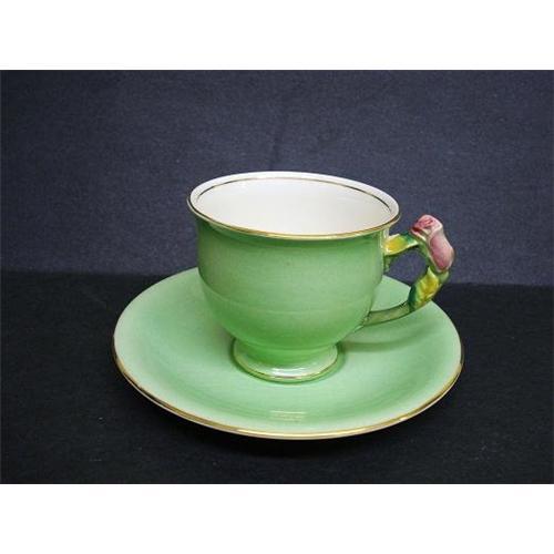 ROYAL WINTON GRIMWADES ENGLAND, CUP AND SAUCER, FINISHED IN FRESH, LIGHT GREEN COLOR, WITH FIGURAL HANDLE DEPICTING VERY PRETTY AND COLORFUL ROSEBUD,as per images - excellent used condition, no chips or cracks, US Buyer to pay 7.00 for shipping plus insurance.THANKS.