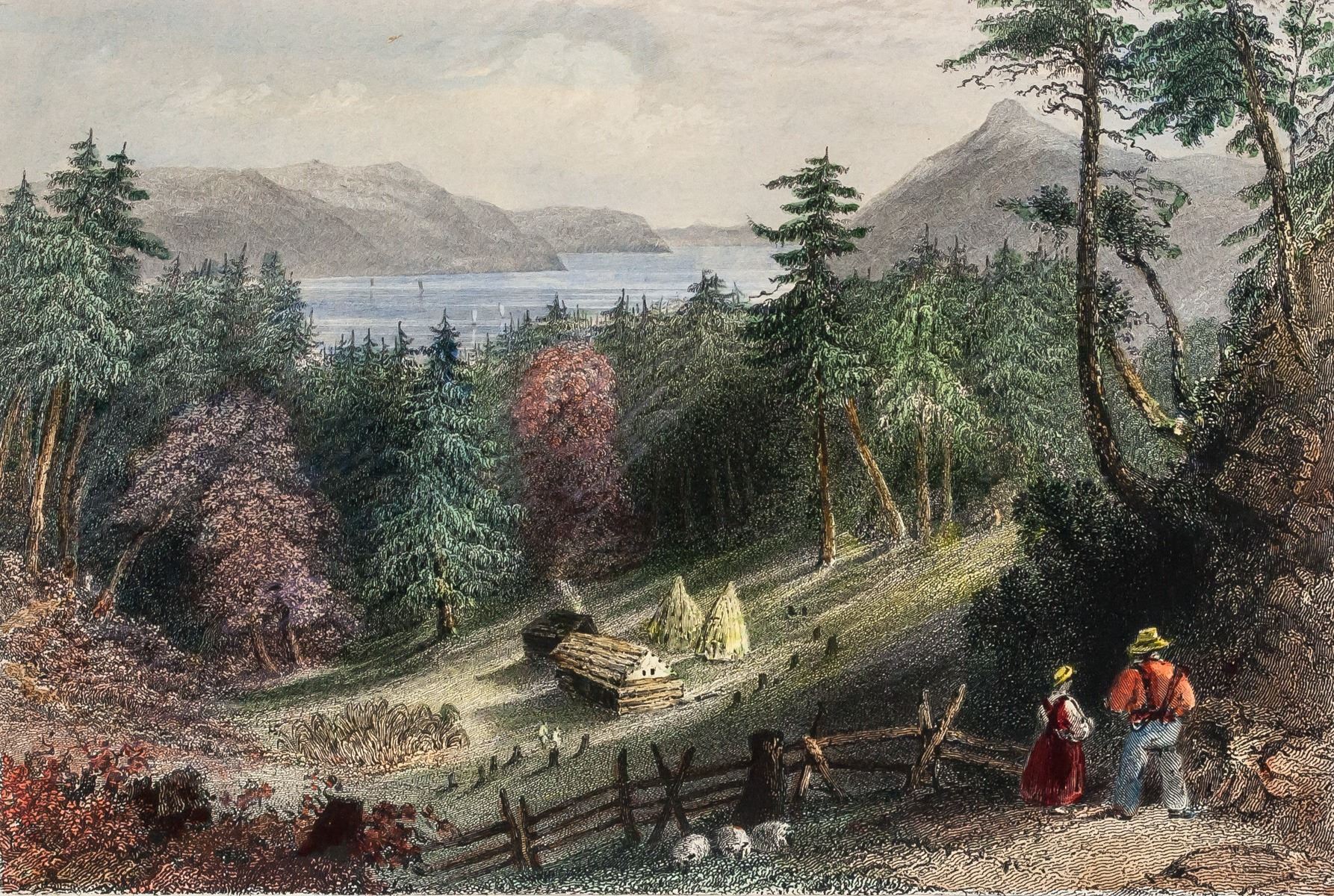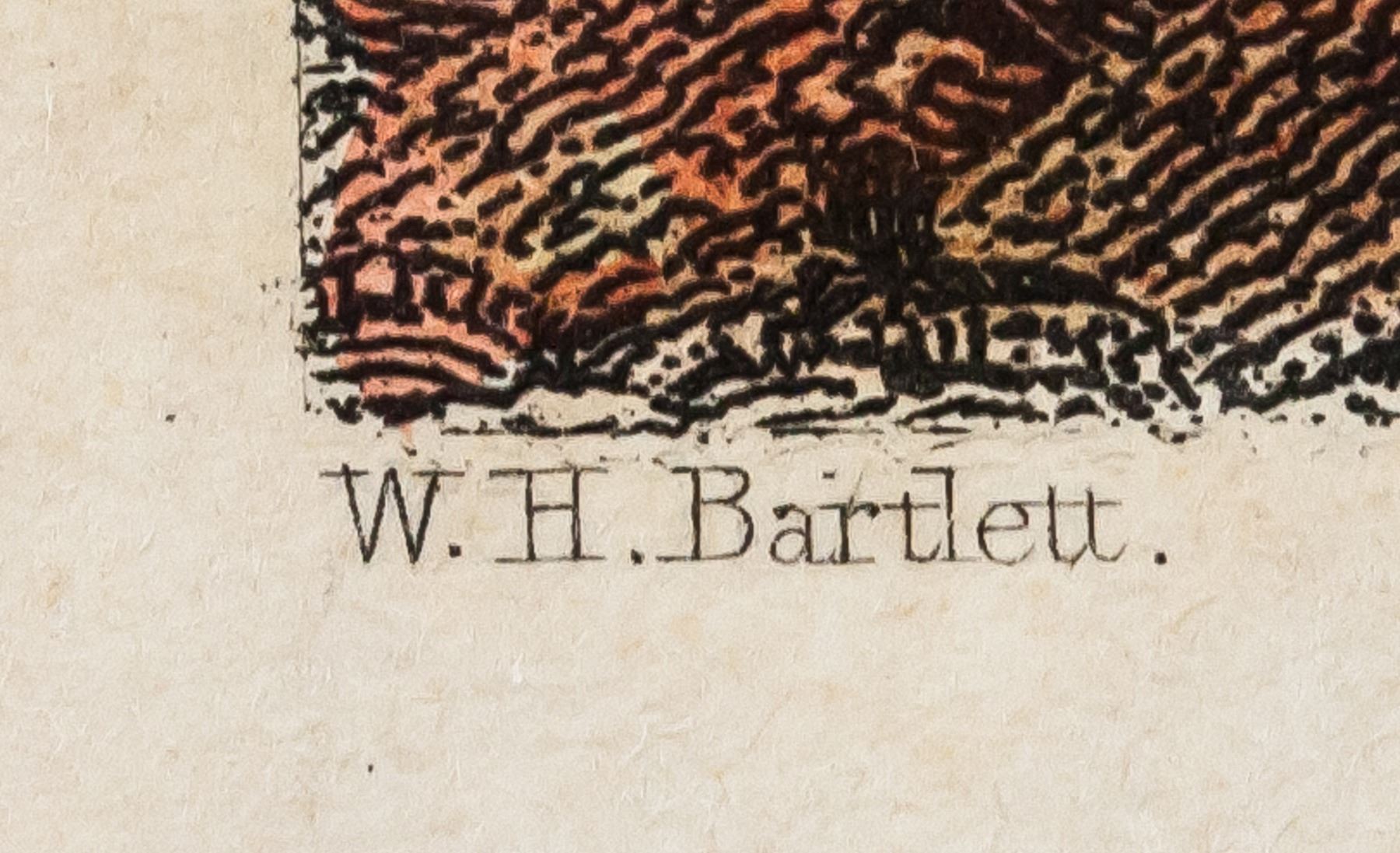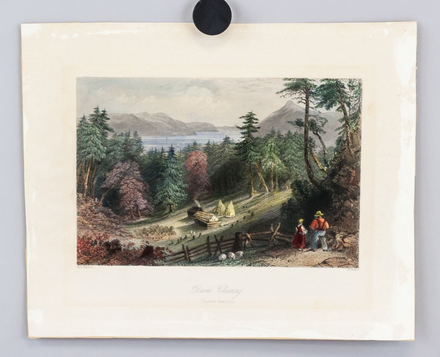 Print. Featuring farmland scene with two figures standing by a wooden fence with a lake in the background. "R. Wallis" printed ro the bottom right, beneath the image. "W. H. Bartlett" printed to the bottom left, beneath the image. "Davis Clearing (Eastern Township) printed in the center, beneath the image. 20 x 24.5 cm (8 x 9.75 inches). PROVENANCE: Hamilton, Ont. Estate