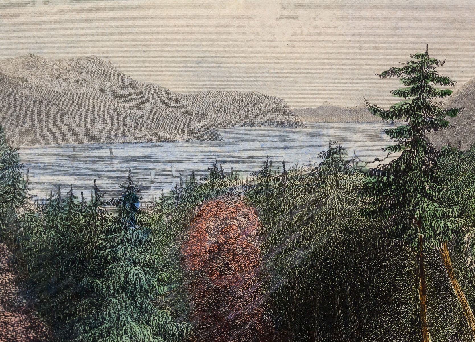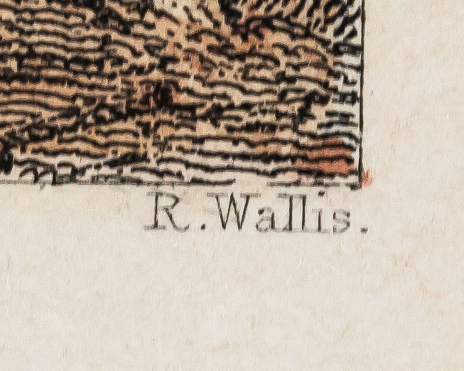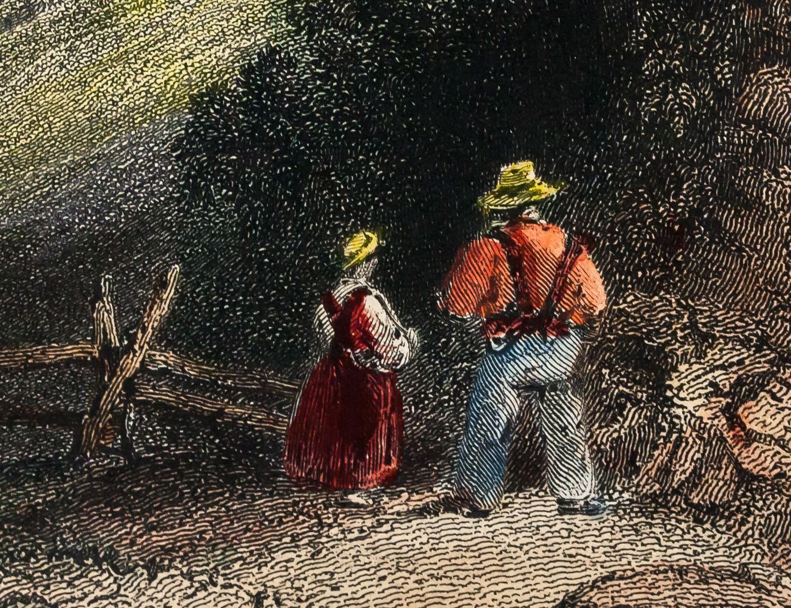 Print. Featuring farmland scene with two figures standing by a wooden fence with a lake in the background. "R. Wallis" printed ro the bottom right, beneath the image. "W. H. Bartlett" printed to the bottom left, beneath the image. "Davis Clearing (Eastern Township) printed in the center, beneath the image. 20 x 24.5 cm (8 x 9.75 inches). PROVENANCE: Hamilton, Ont. Estate