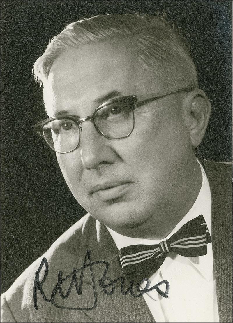 Basketball Hall of Famer (1906–1981) widely known for his decision at the 1972 Olympic Basketball Final, where the United States was facing the Soviet Union and had won the game 50-49, to order the officials to put 3 seconds back on the clock for a clock malfunction, allowing the Soviet team to score and win 51-50. Matte-finish 4 x 5.75 close-up photo, signed in black felt tip, “R. W. Jones.” In fine condition, with a bit of light silvering to background.