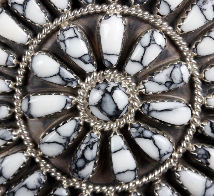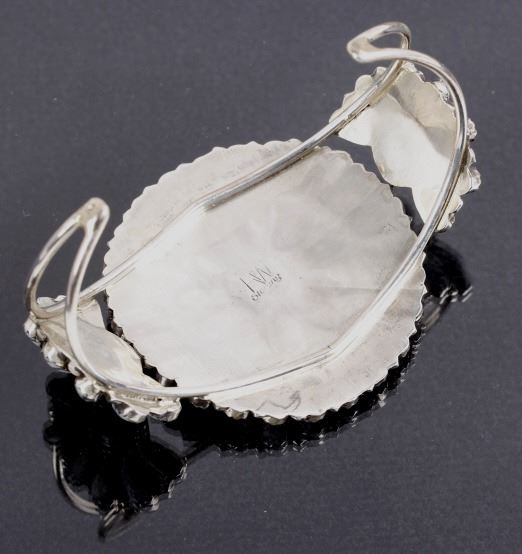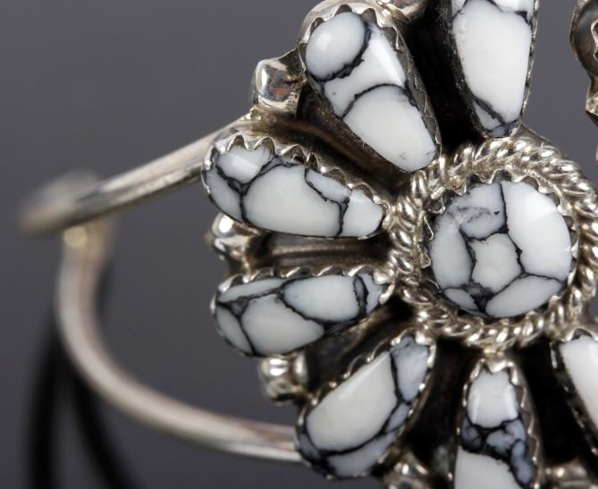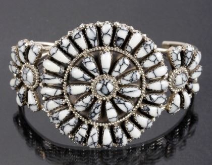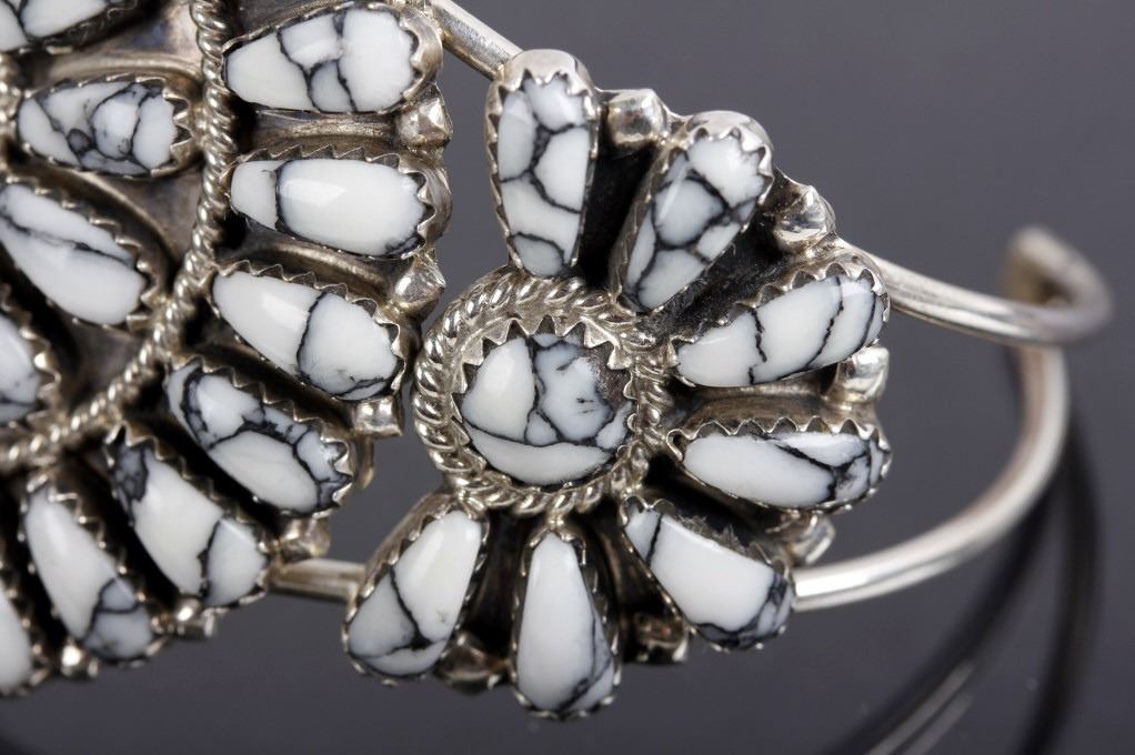 Available for your consideration in this lot is a signed Navajo Native American Indian, sterling silver & white buffalo turquoise petit point cuff or bracelet. The bracelet shows three silver plates, soldered to a two-bar cuff, all adorned with white buffalo turquoise. The cuff is signed on the back "RW - Sterling", attributing the cuff to expert Navajo silversmith - Rosana Williams. The cuff measures 2 5/8" wide, and 1 3/4" tall. The inside circumference of the cuff equals approximately 6 1/2".