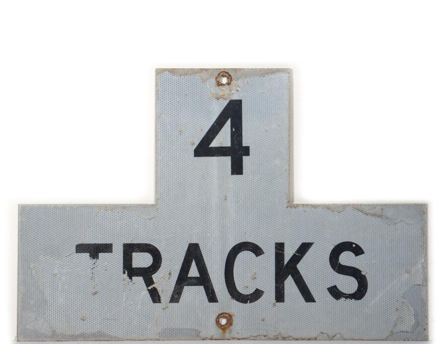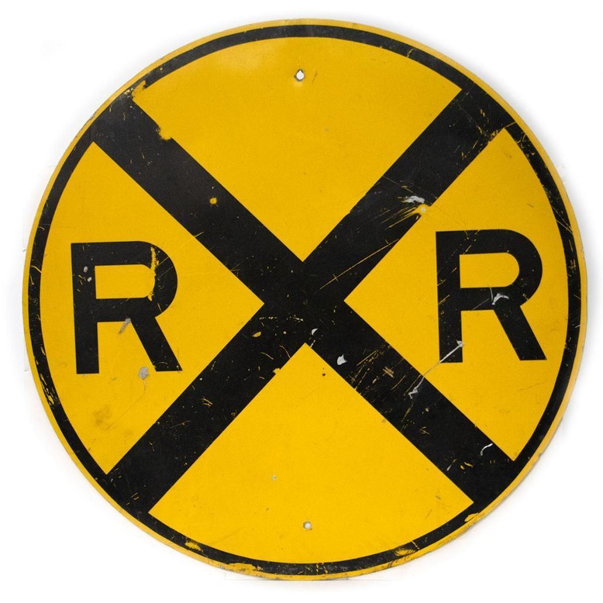 Sign Weathered and dirty with dents and dings Approximately 30 inch diameter R X R Black on Yellow reflective sign on aluminum substrate Sign Weathered and dirty with dents and dings Approximately 24 inches wide and 18 inches high. Black on reflective white. “4 TRACKS†with damage to lettering